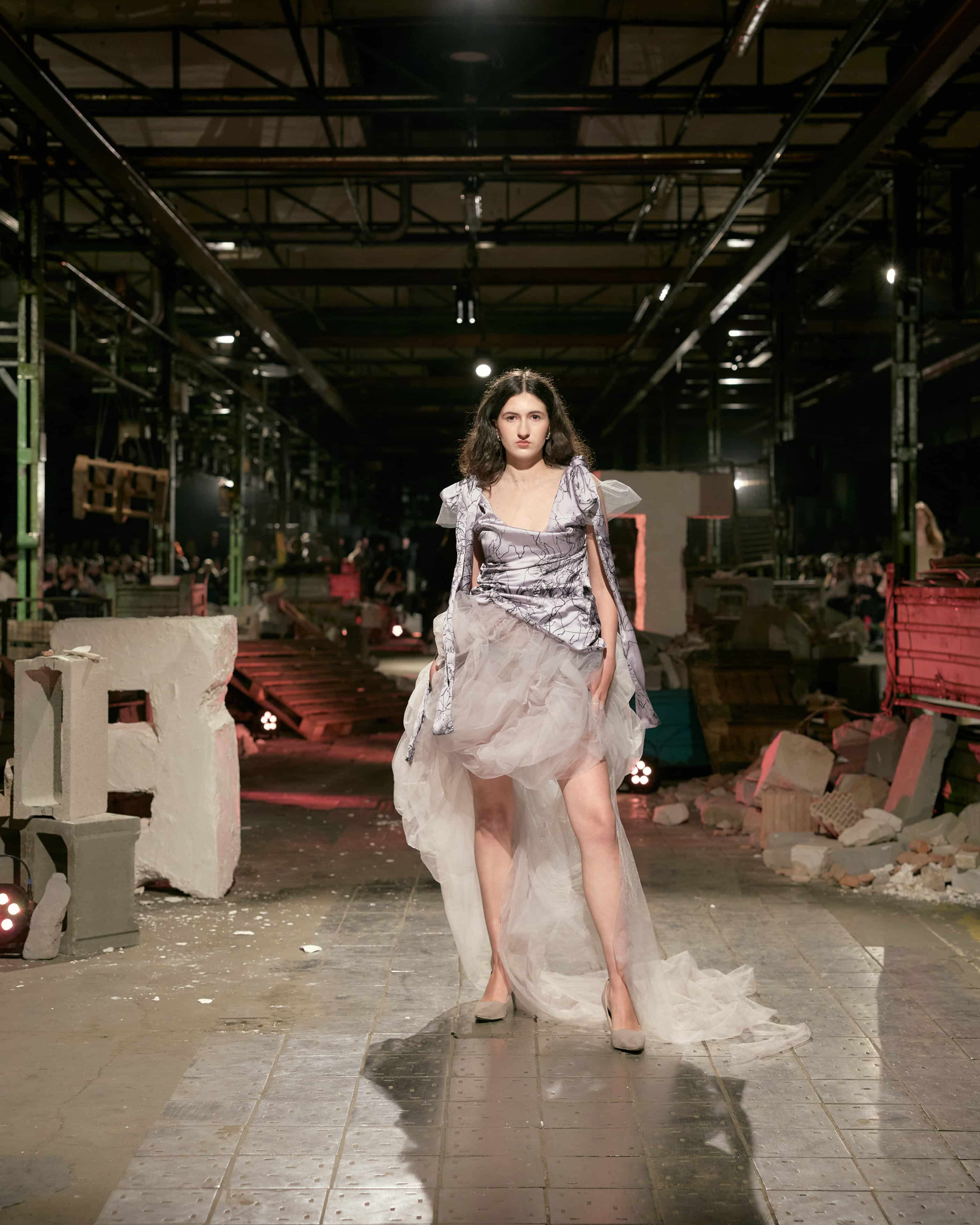 Fragmenty přenesla z abstraktní do fyzické roviny Tara Gugová v řadě Preservation in Fragmentation. Kůže na sebe metaforicky vzala podobu těla poznamenaného rýhami, vráskami a skvrnami. Drsnost kožených prvků umně vyvážila jemným šifonem. Tereza Helánová pak sáhla do svého nitra i rodinného archivu a v projektu Remain transformovala oděv na médium reflektující životní příběh své babičky. Jako nosný narativní prvek využila retro siluety evokující moment, kdy nás v dětství babička pustila do své „zapovězené“ skříně.