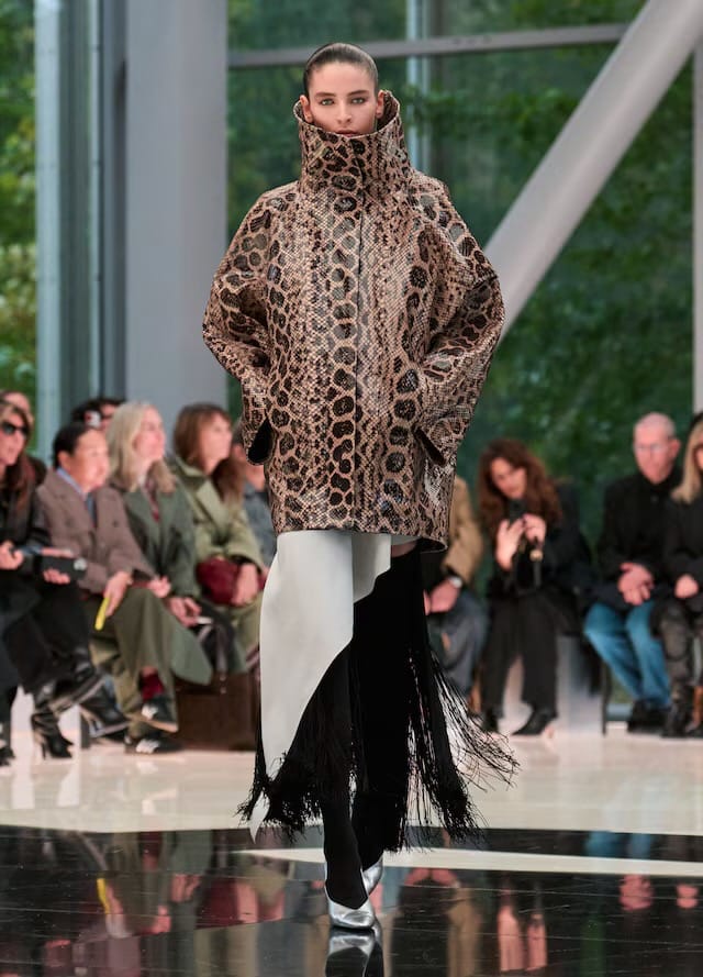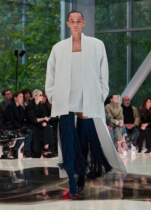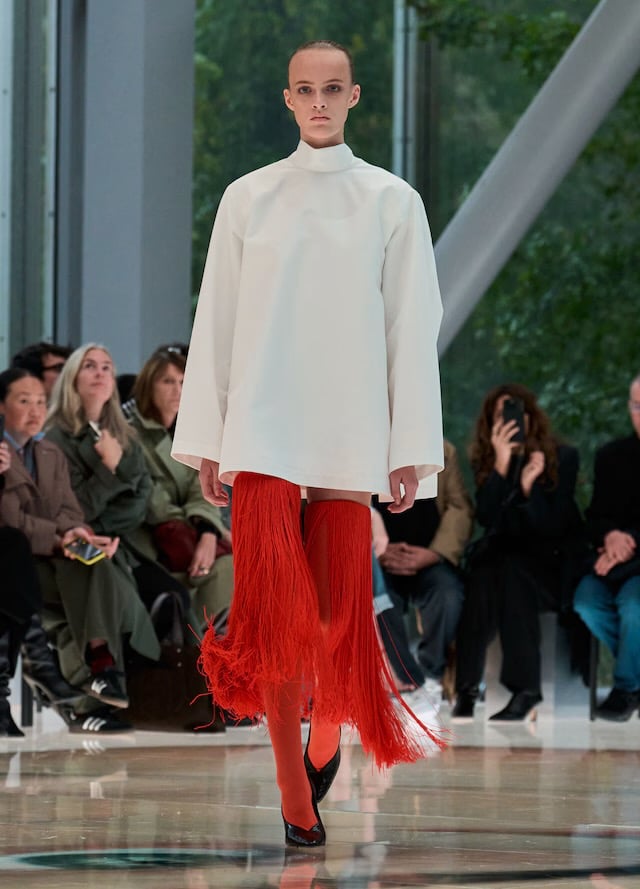 V analytickém smyslu je Alaïa SS26 studií rovnováhy. Každý model působí jako experiment mezi stálostí a proměnlivostí. Úvodní bílý oversized top s vysokým límcem, spárovaný s karmínovými návleky pokrytými třásněmi, definuje osu celé kolekce. Ticho kontrastuje s dynamikou. Dialog mezi klidem a energií se stává hlavním motivem následující jarní a letní sezóny. Tvar se mění s každým pohybem těla, ale nikdy neztrácí svou kontrolu.