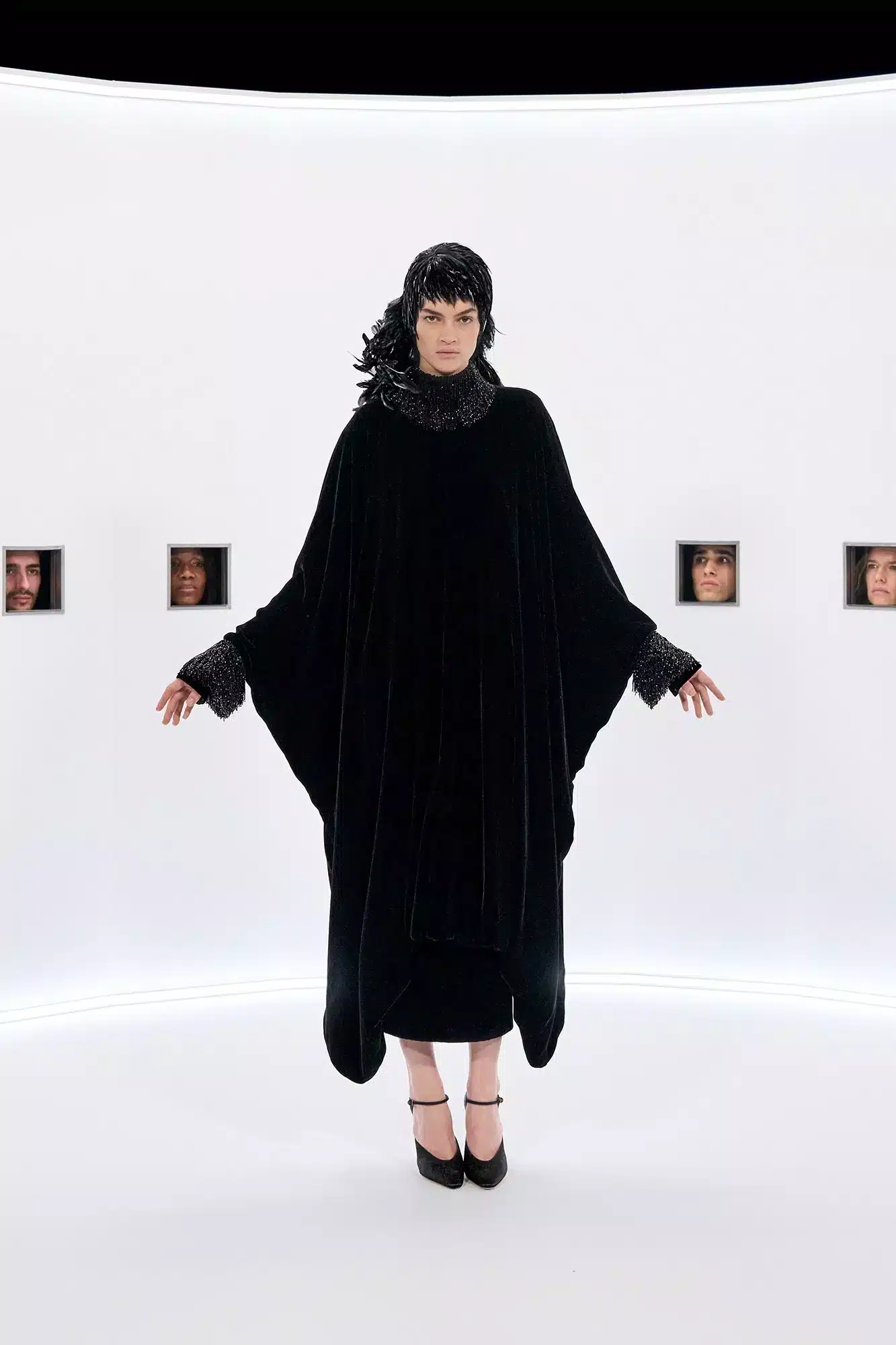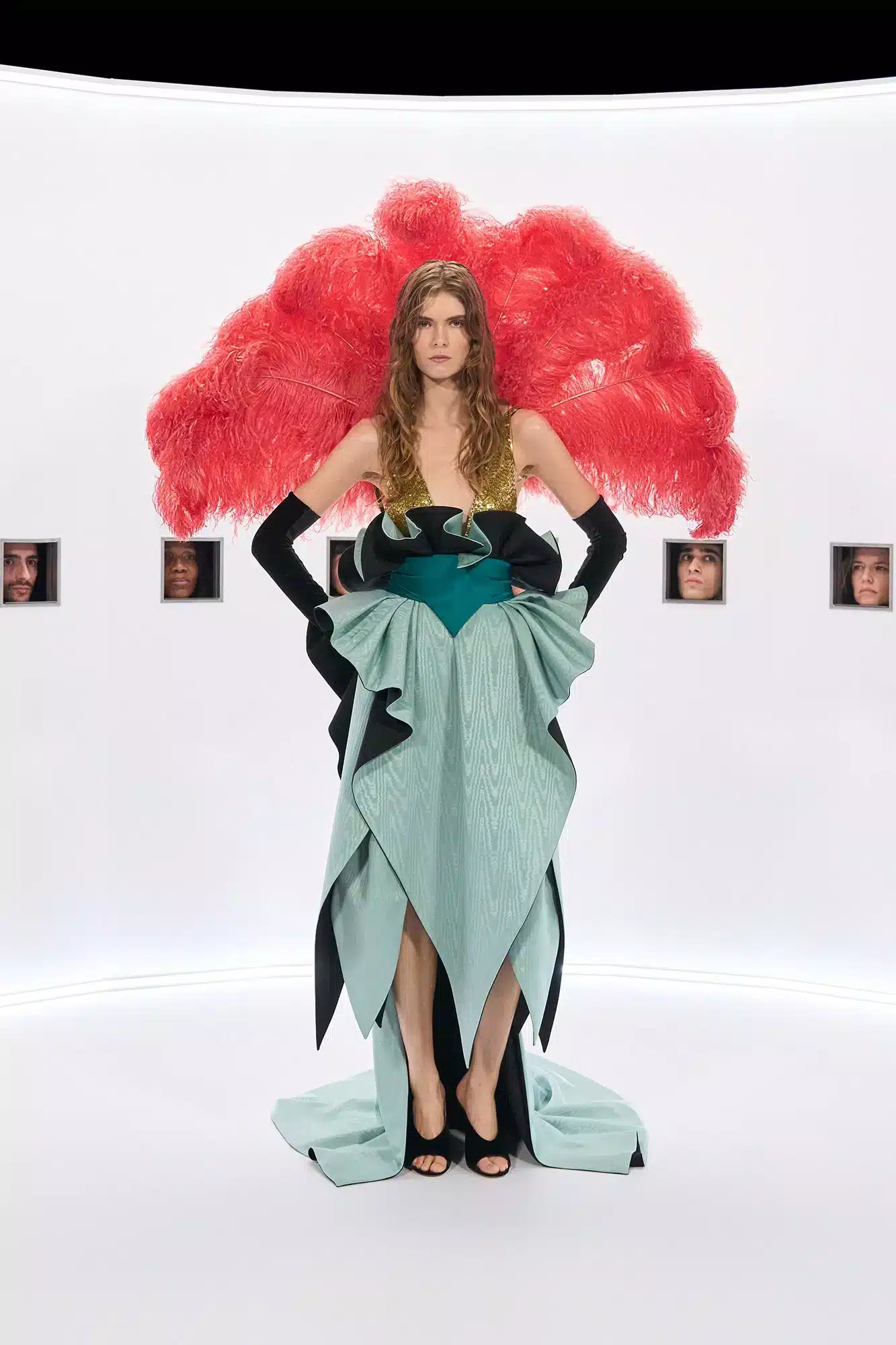 Dramatičnost outfitům dodávaly rovněž spektakulární koruny křičící hlasem filmové scény 40. let. Rovné jim bylo také barevné peří, které se modelkám sebevědomě dmulo za hlavami. Maximalistické kožichy, skulpturální rukávy a nánosy šperků hodné největších hvězd filmového plátna potvrdily umění Alessandra Michele vyprávět příběhy. Jednotlivé prvky použil jako působivé dílky své až téměř mytologické vize.