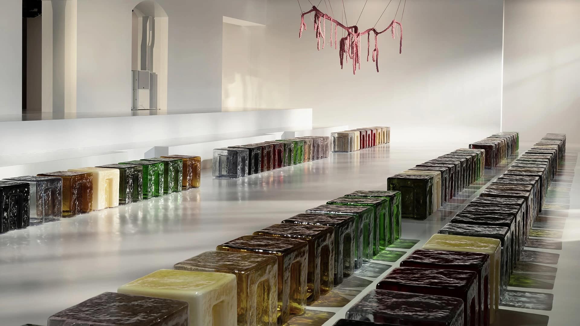 Prostor přehlídky s minimalistickými oblouky a skleněnými objekty vytvořil kulisu, jež nechala vyznít samotné modely. Publikum sedělo na barevných skleněných stoličkách, čímž se architektura scény stala nekontrastní a organickou součástí přehlídky. Web NSS uvedl, že vzduch byl nabitý soustředěním, připomínajícím galerijní instalaci. Každý pohled směřoval k detailu, ať už to byla textura kůže, nebo způsob, jakým třásně reagovaly na světlo.