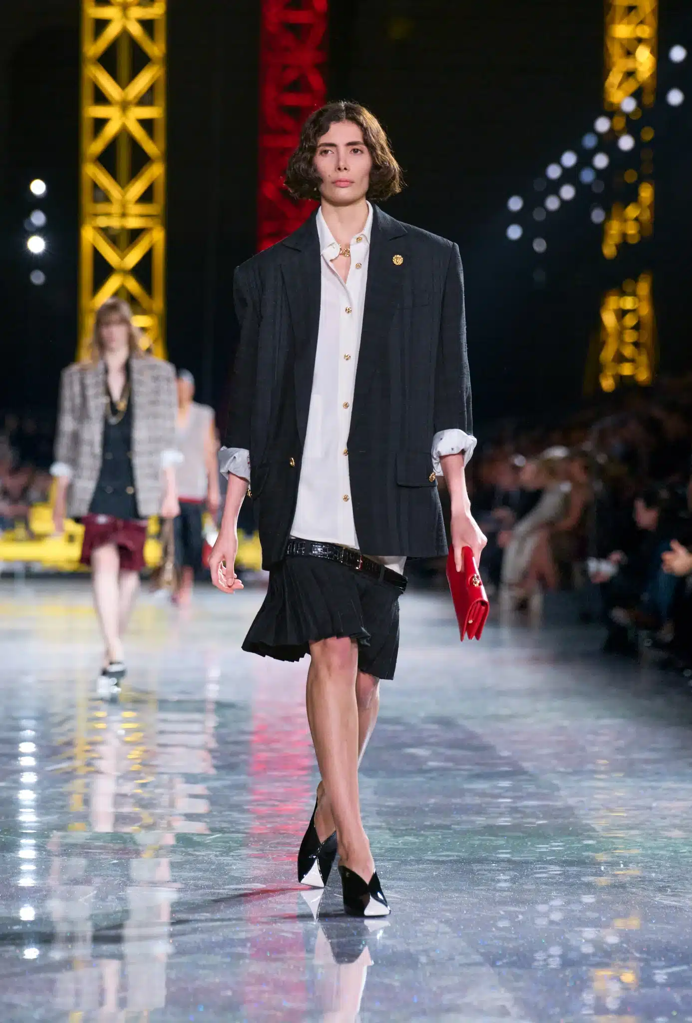 Několik typicky Chanel kousků pak sloužilo jako červená nit propojující návrhy do fungujícího celku. Nechyběl například tvídový kostýmek, který však rovněž podlehl změnám, ať už v podobě zipů nahrazujících knoflíky, nebo provedení v technických tkaninách či lurexu. Speciální pozornosti se dočkala rovněž nonšalantně stylizovaná klasická košile, kdysi přejatá z pracovního úboru, kterou si Matthieu Blazy oblíbil.