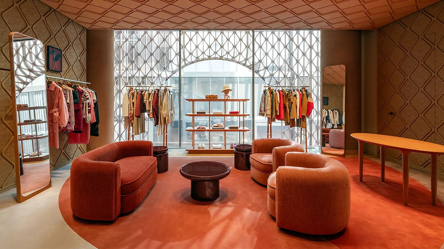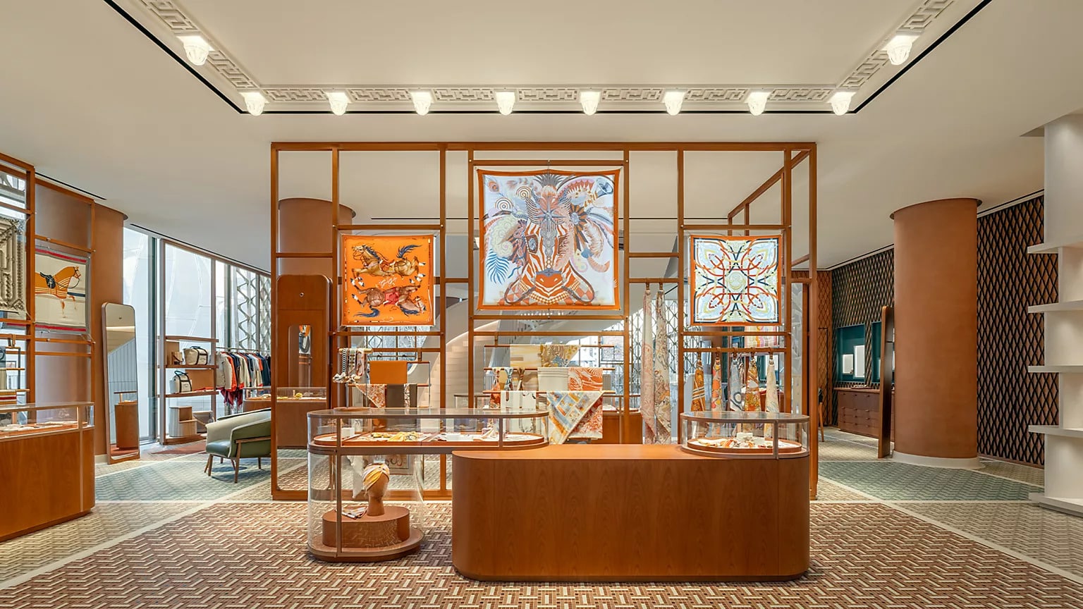 Interiér čerpá inspiraci z tradiční čínské architektury. Zakřivené linie střech, hřejivé sluncem zalité tóny a vrstevnaté materiály se elegantně prolínají v každém detailu výzdoby. Barevná paleta vychází ze starých čínských maleb. Každý kout butiku zve návštěvníky k objevování světa Hermès, v němž se precizní řemeslo a estetika stávají opravdovým zážitkem. Místo, kde se nakupování mění v elegantní rituál.