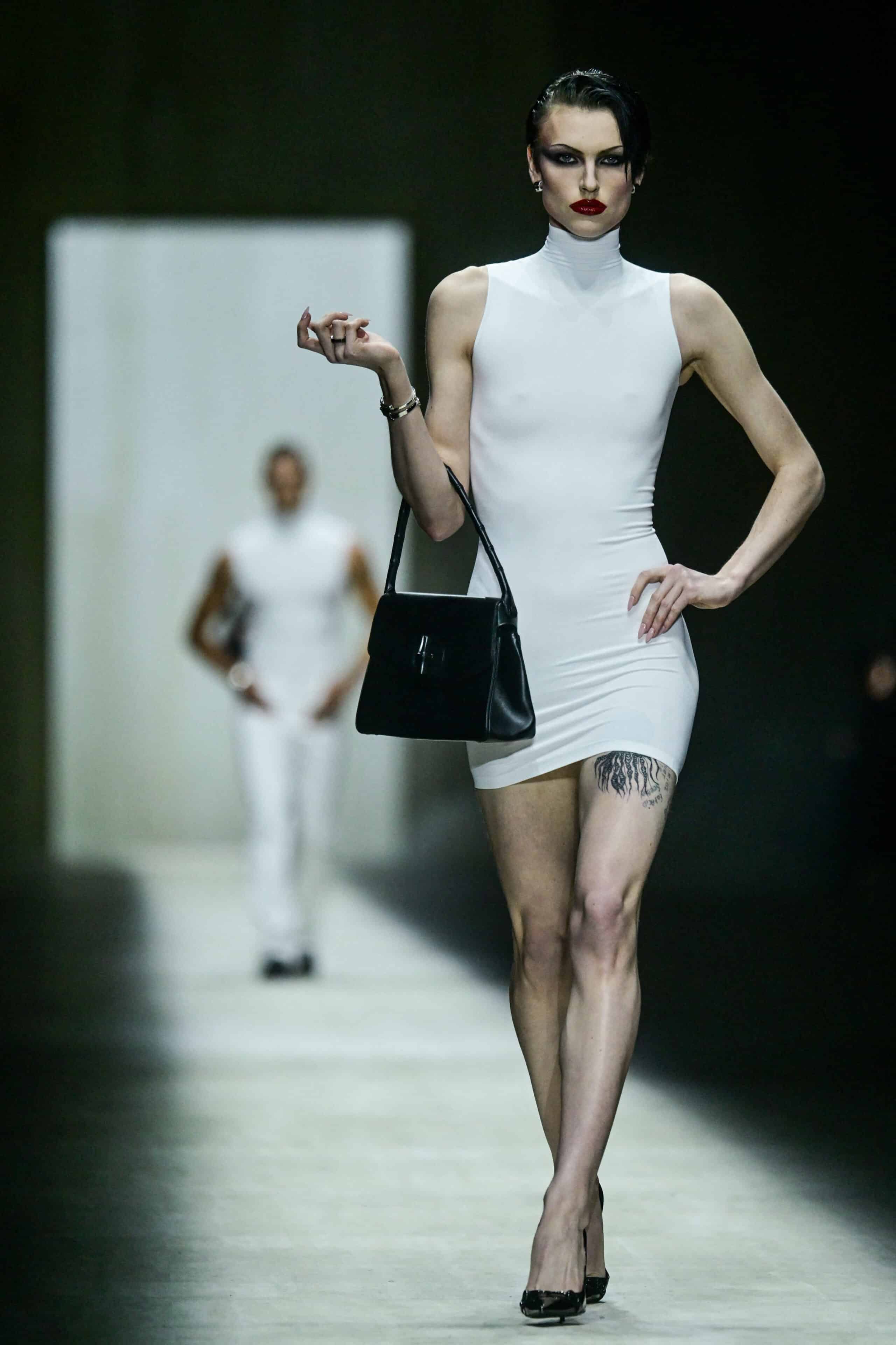 Samotné siluety překvapily. Kdo čekal pokračování Balenciaga estetiky, mýlil se. Oversized střihy ustoupily přiléhavosti. Modelové oblékli těsná trička, kožené bundy a úzké kalhoty, ženy zase mini saka, bodycon šaty a úzké sukně. Erotické napětí, které definovalo Gucci přelomu milénia, se vrátilo v současném provedení. Demna v jednom z rozhovorů promluvil o soužití dědictví a aktuální módy, které se navzájem neustále živí. Kolekce působila nositelně, ale zároveň silně stylizovaně.