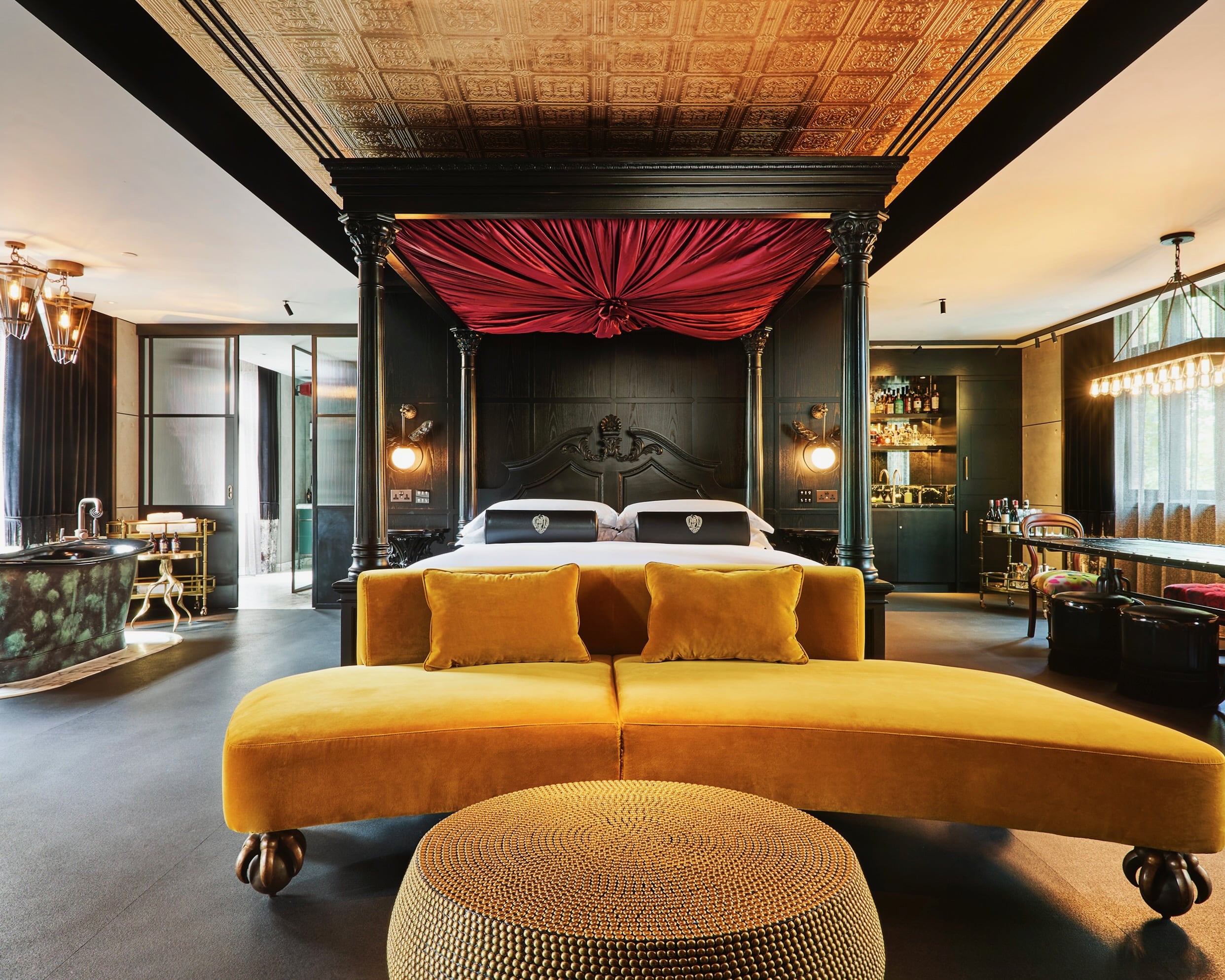 Chateau Denmark v Londýně nestaví na uhlazenosti ani klasické představě luxusu. Interiéry připomínají temnou rockovou fantazii plnou černého dřeva, kovových detailů, gotických zrcadel a obřích postelí s nebesy. Každý pokoj pracuje s jinou estetikou, všechny ale spojuje stejná punkově-rocková nálada. Člověk má pocit, že nevstupuje do hotelu, ale do bytu rockové hvězdy, která odešla jen na chvíli.