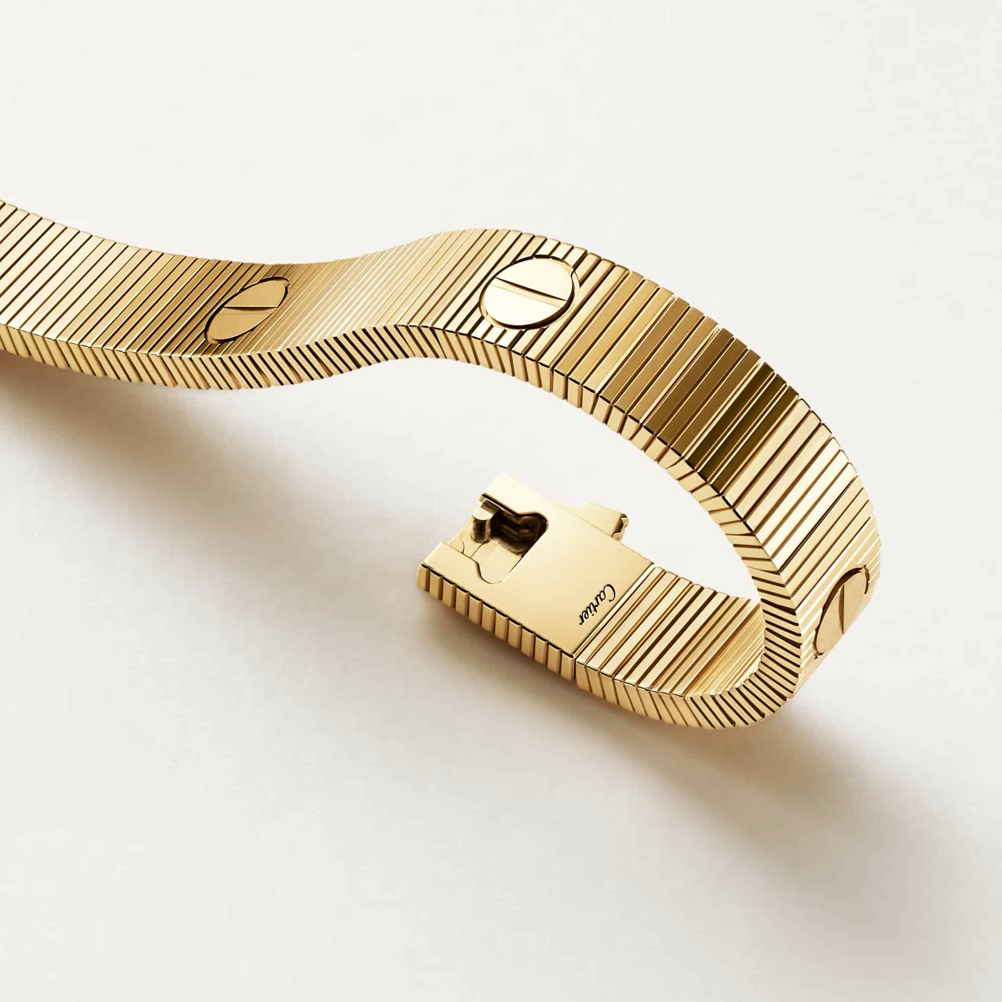 O téměř šest desetiletí později přichází Love Unlimited. Reinterpretace, která ctí stejný princip, avšak hovoří novým jazykem. Z pevného kruhu se stává pohyblivý náramek, proud kovu, který se přizpůsobuje pohybu rukou. V ateliérech Cartier se designéři a zlatníci rozhodli překonat logiku originálu a vytvořili systém mikro článků, spojených neviditelným mechanismem, jenž umožňuje naprostou plynulost.