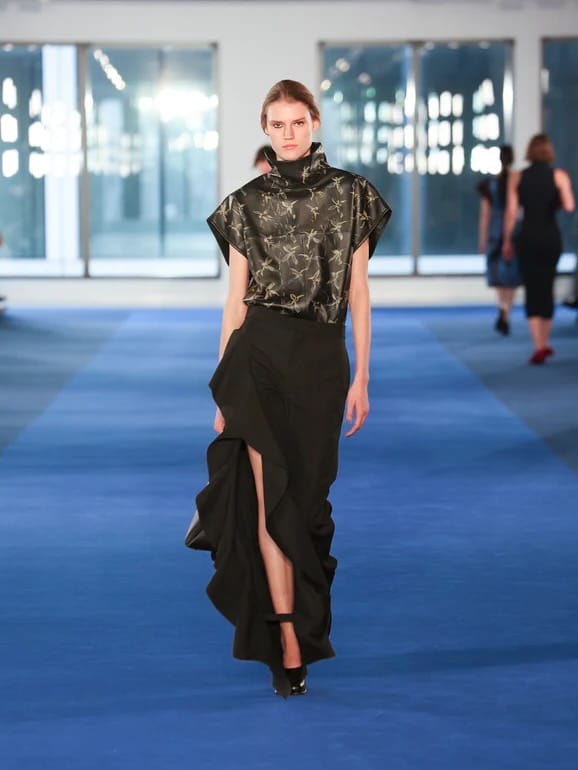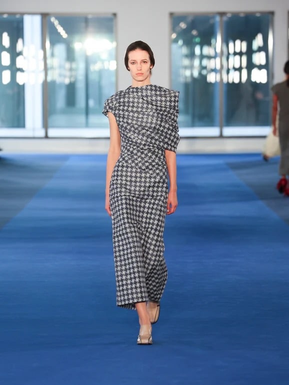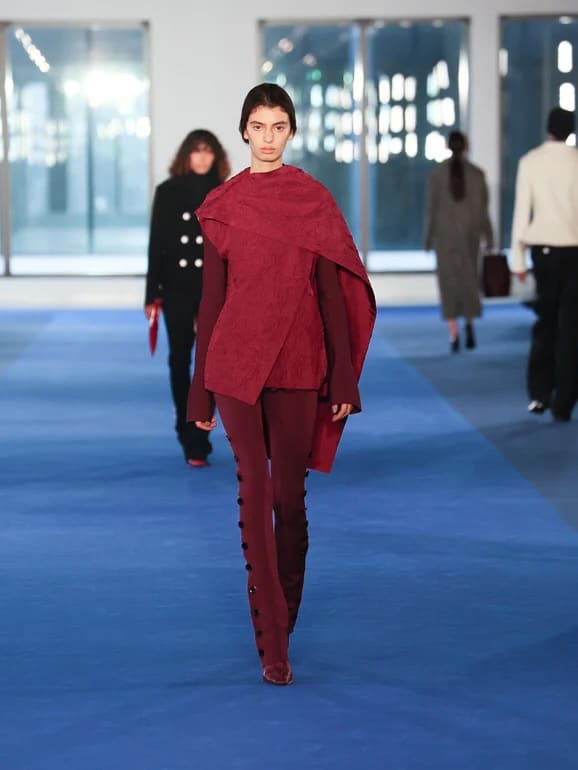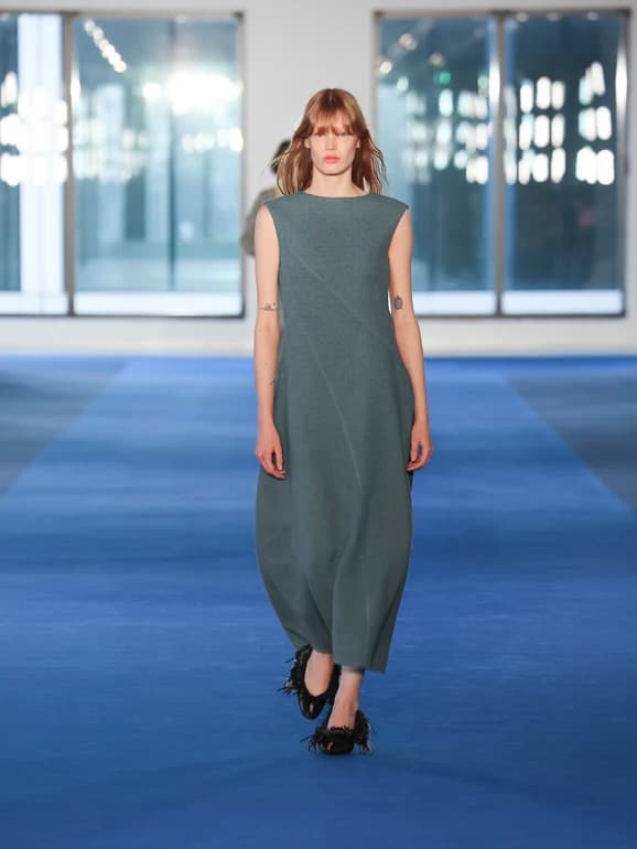 První model, tmavě tyrkysové pouzdrové šaty s lehce nepravidelnou strukturou, naznačil, že hlavním motivem nebude forma, ale tempo. Siluety působily, jako by právě vystoupily z metra. Šaty byly jemně pomačkané, sukně stočené do spirály, kabáty rozvlněné. Vše vyvolávalo dojem pohybu. Rachel Scott vytvořila městskou hrdinku, která spěchá, ale nepůsobí roztěkaně. Je klidná, nedostupná a přesně ví, kam jde.