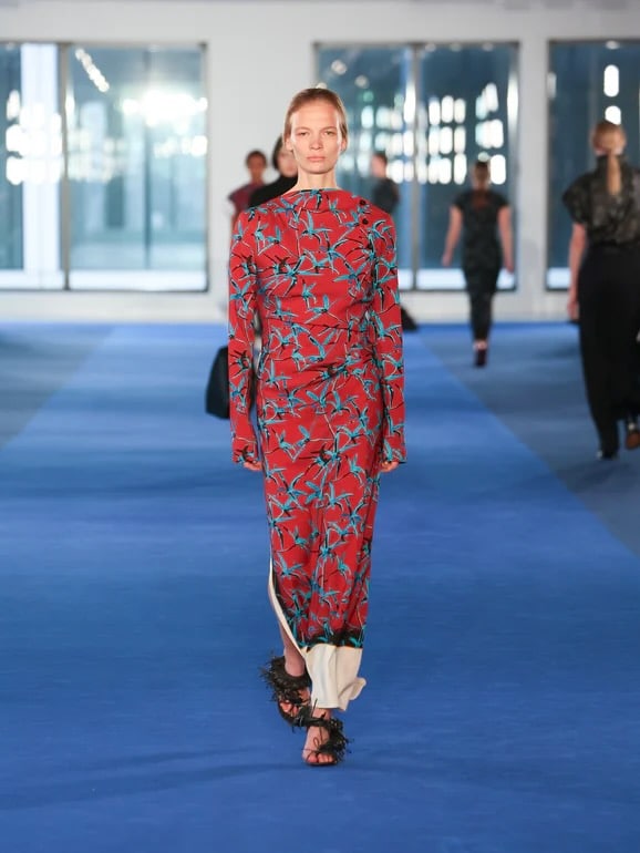 Velkou roli hrály také materiály. Donegalské pleteniny, viskóza a vlna vytvářely pevný základ, zatímco hedvábí bylo záměrně mačkané a plisované. Nitě byly kroucené a barevně živé, stejně jako bohaté květinové motivy. Estetika se tak pohybovala mezi organikou a technologií. Kabelky připomínaly archiv značky, ale v semiši nebo hutných odstínech působily nově. Boty se čtvercovou špičkou a třásněmi vypadaly jako designérský komentář o eleganci, která už nechce být uhlazená. Vznikl tak obraz, jenž rezonoval na hranici nositelnosti a teatrálnosti.