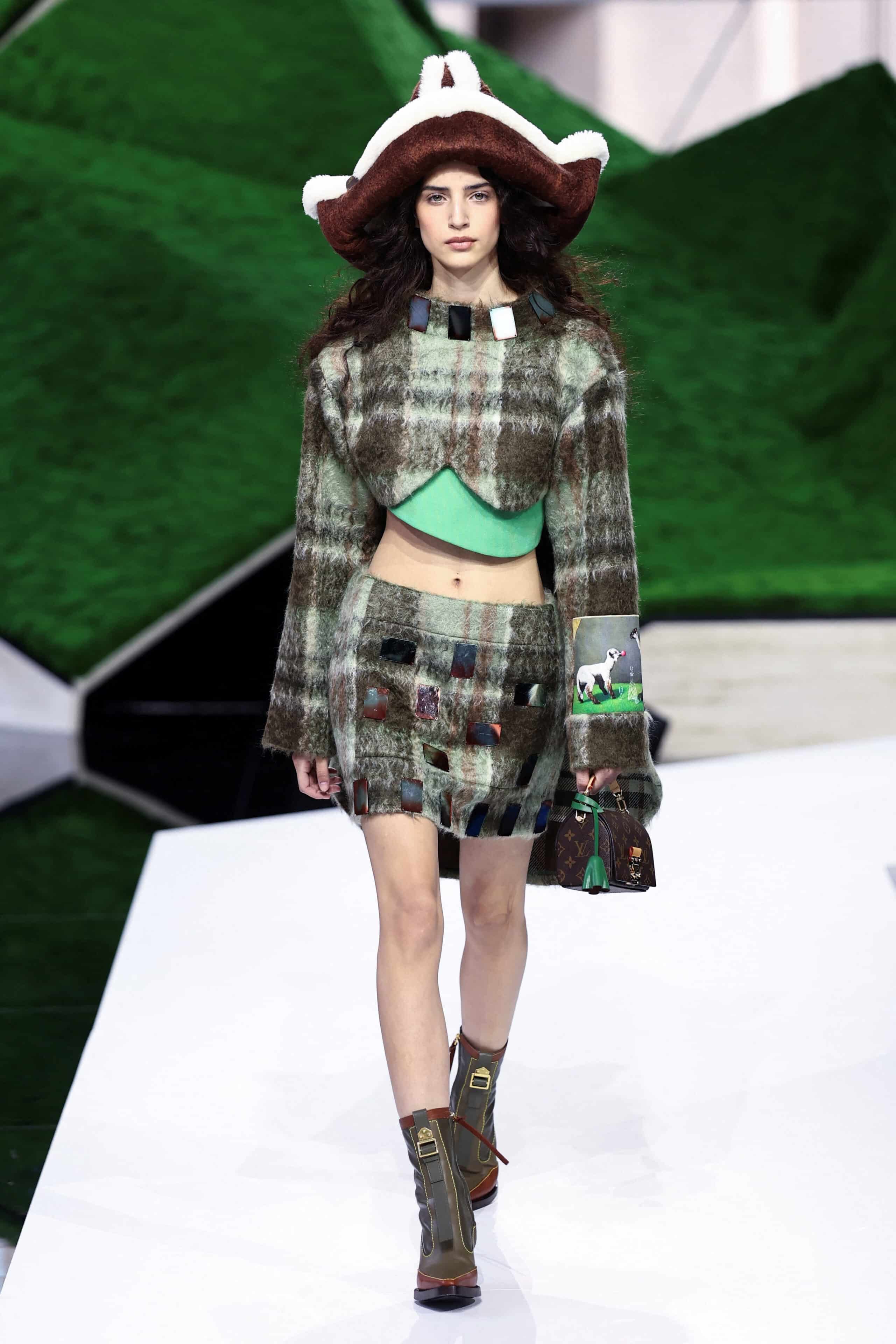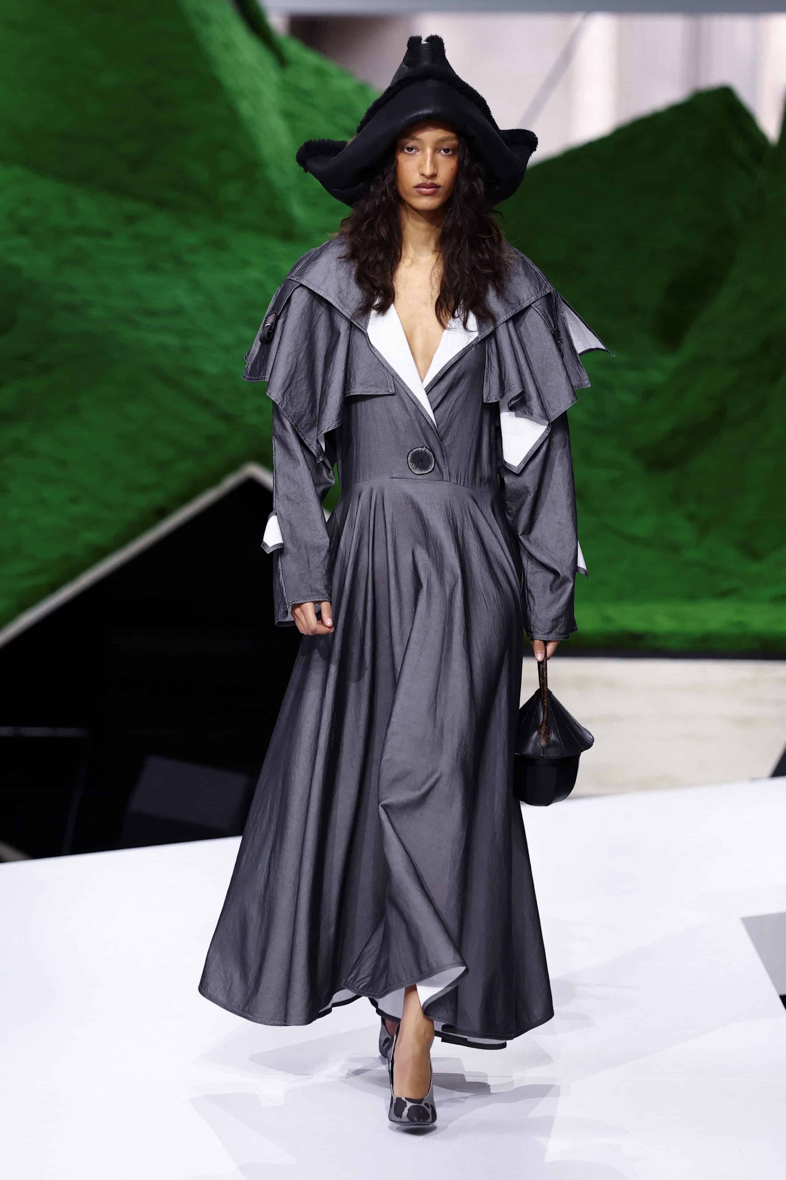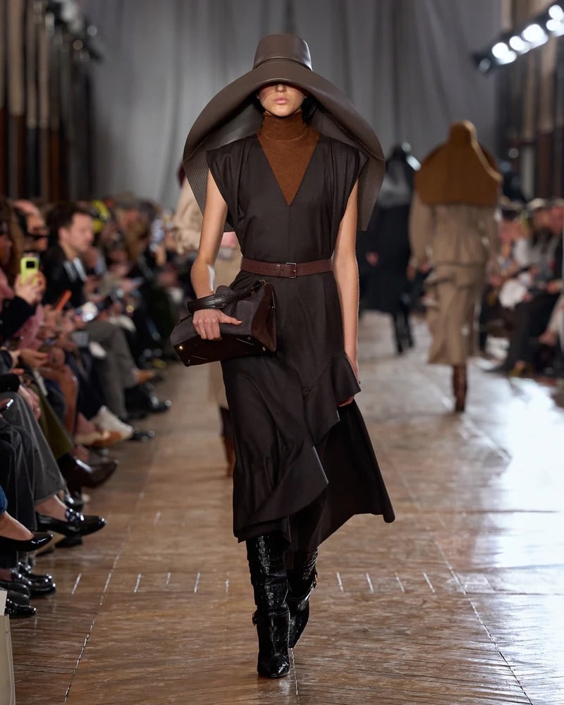 Louis Vuitton pod vedením Nicolase Ghesquière posouvá v řadě FW26 hru s pokrývkami hlavy do mytologické roviny. Kolekce inspirovaná krajinou nepřináší jen objemné siluety a vrstvení materiálů, ale i headpieces, které připomínají objekty vytesané větrem. Obří klobouky stíní tvář natolik, že modelka přestává být jednotlivcem a stává se součástí přírodního celku. Jinde se tvar láme do ostrých linií, jako by kopíroval horizonty hor nebo střechy horských chat. Cílem však rozhodně není ochrana před počasím. Spíše vizuální přenesení pohybu krajinou.
