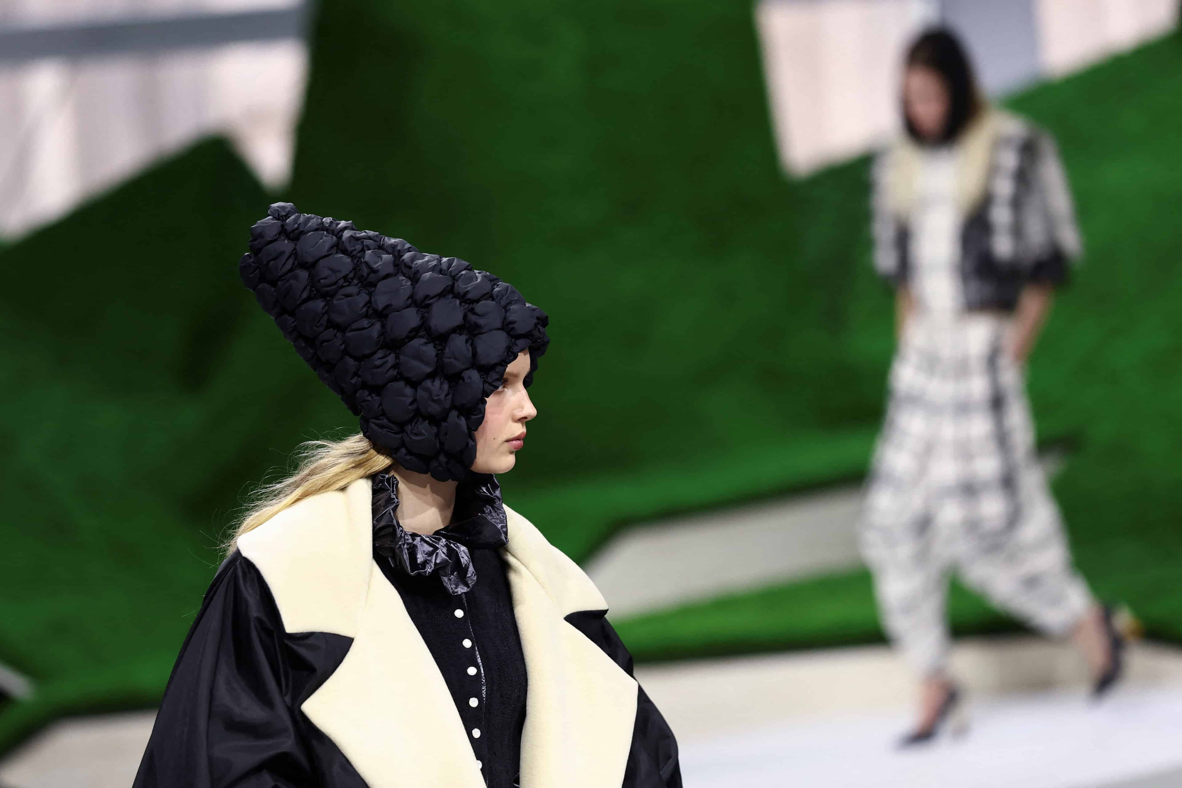 Ten kontrast je fascinující. Kolekce, která vychází z praktičnosti a oděvu jako nástroje přežití, si zároveň dovolí momenty, jež s funkčností nemají nic společného. A právě v tom je její síla. Klobouky nejsou logické. Jsou výrazem a především jazykem zkušenosti návrháře, jenž zachránil kdysi umírající značku Balenciaga a poté přesedlal k přednímu francouzskému velikánu, jako je Louis Vuitton. Klobouky Nicolase Ghesquière zkrátka přehánějí, deformují, skrývají. A tím vytvářejí zcela novou a nečekanou dynamiku mezi tělem a prostorem.
