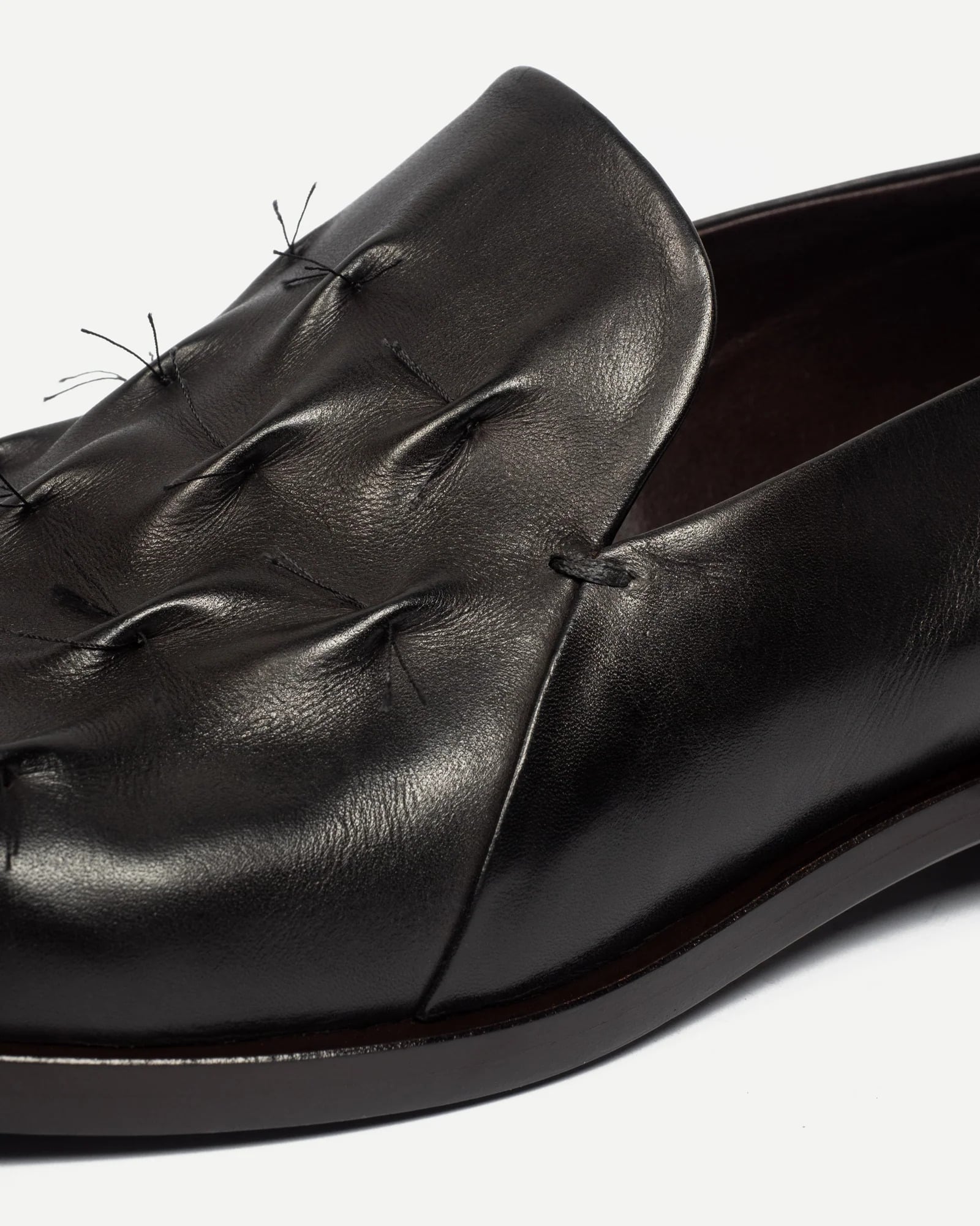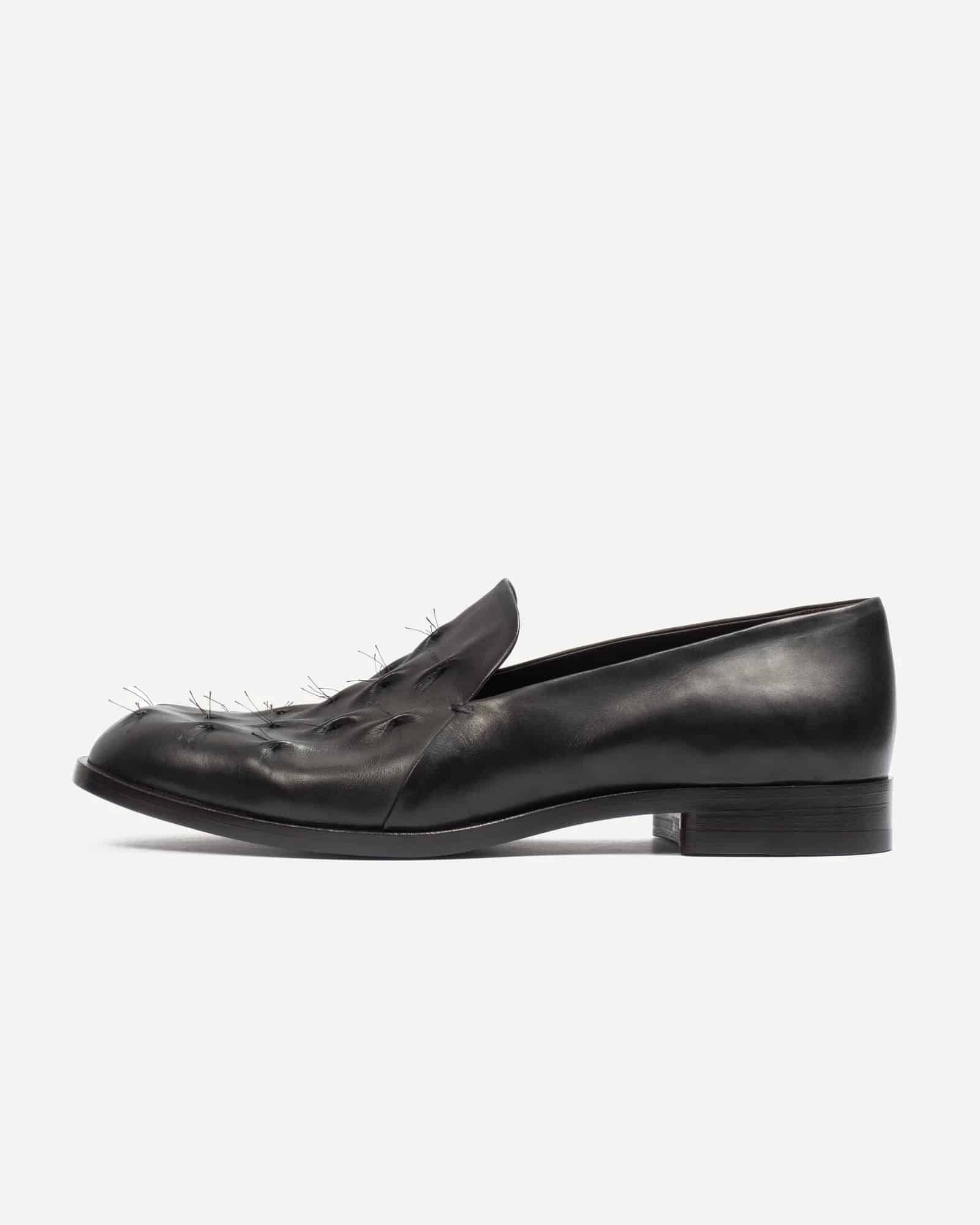 Největším symbolem jejich odvahy je model Wrinkled Slip-on. Nevznikl jako klasický návrh na papíře, ale spíš přímo v dílně při práci s materiálem. Na začátku si hráli se starými technikami z 15. století a zkoušeli je přenést na kůži. Zpočátku šlo jen o experimenty a vzorky bez jasného cíle, spíš o zjišťování, co materiál vůbec zvládne. Zásadní moment přišel ve chvíli, kdy se začali víc soustředit na rubovou stranu kůže, tedy na její vnitřní, běžně skrytou část, která zůstává pod podšívkou a není na první pohled vidět. Právě tam je zaujaly odkryté nitě a přirozené, nepravidelné záhyby, které by jinak zůstaly ukryté. Když tento detail propojili s jednoduchou siluetou polobotek, vznikla bota, která působí uvolněně a přirozeně.