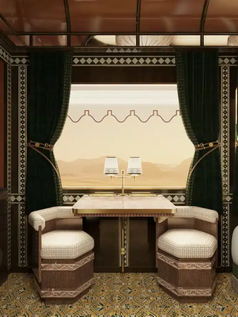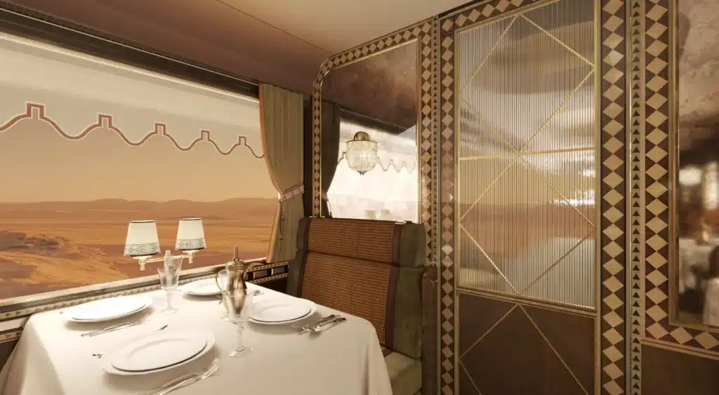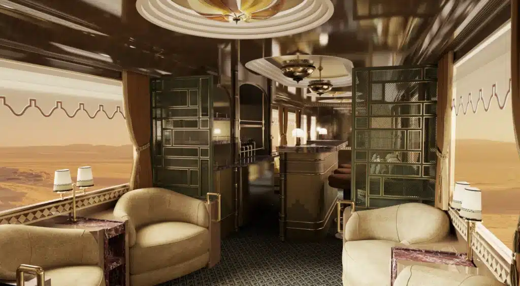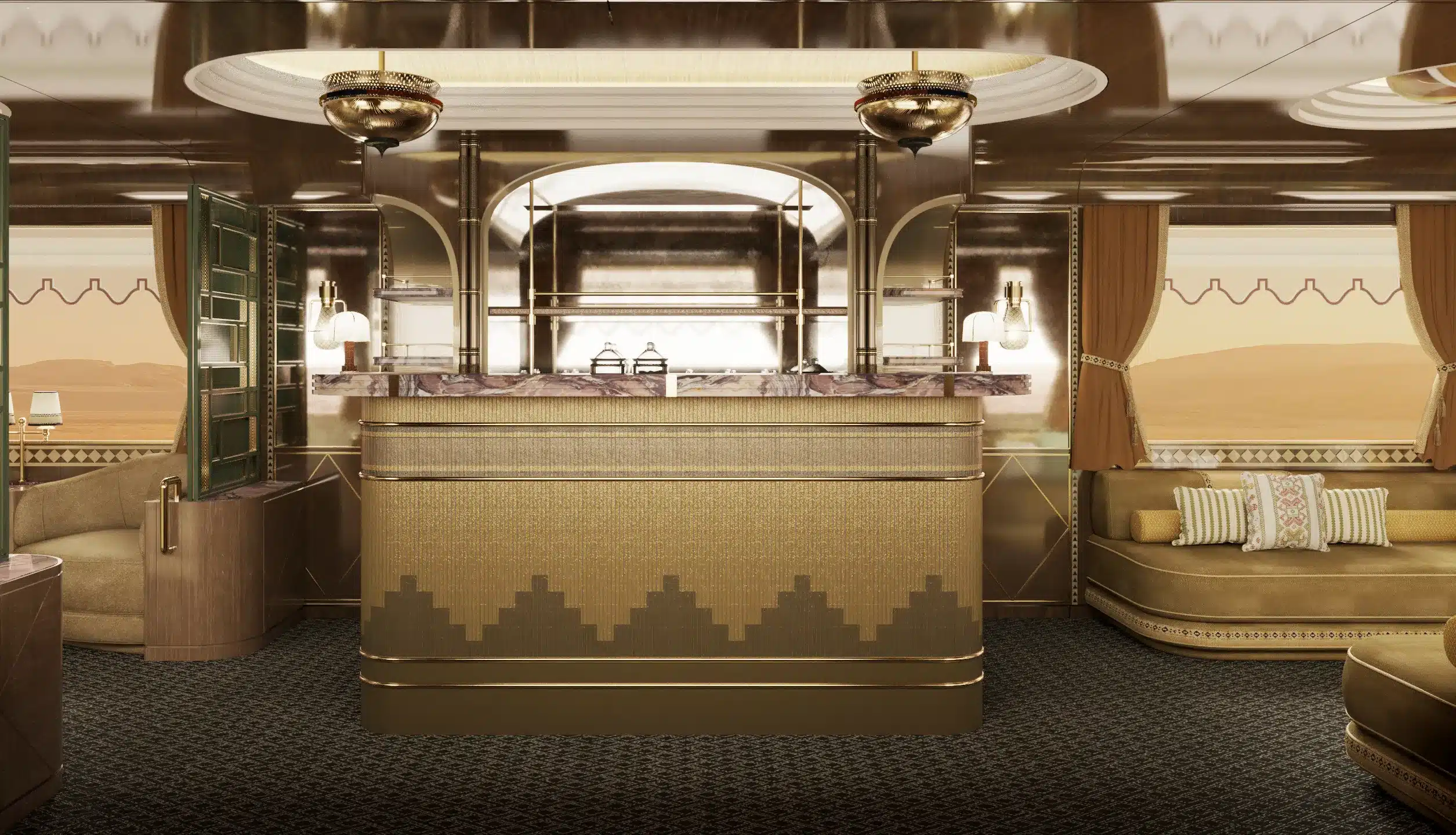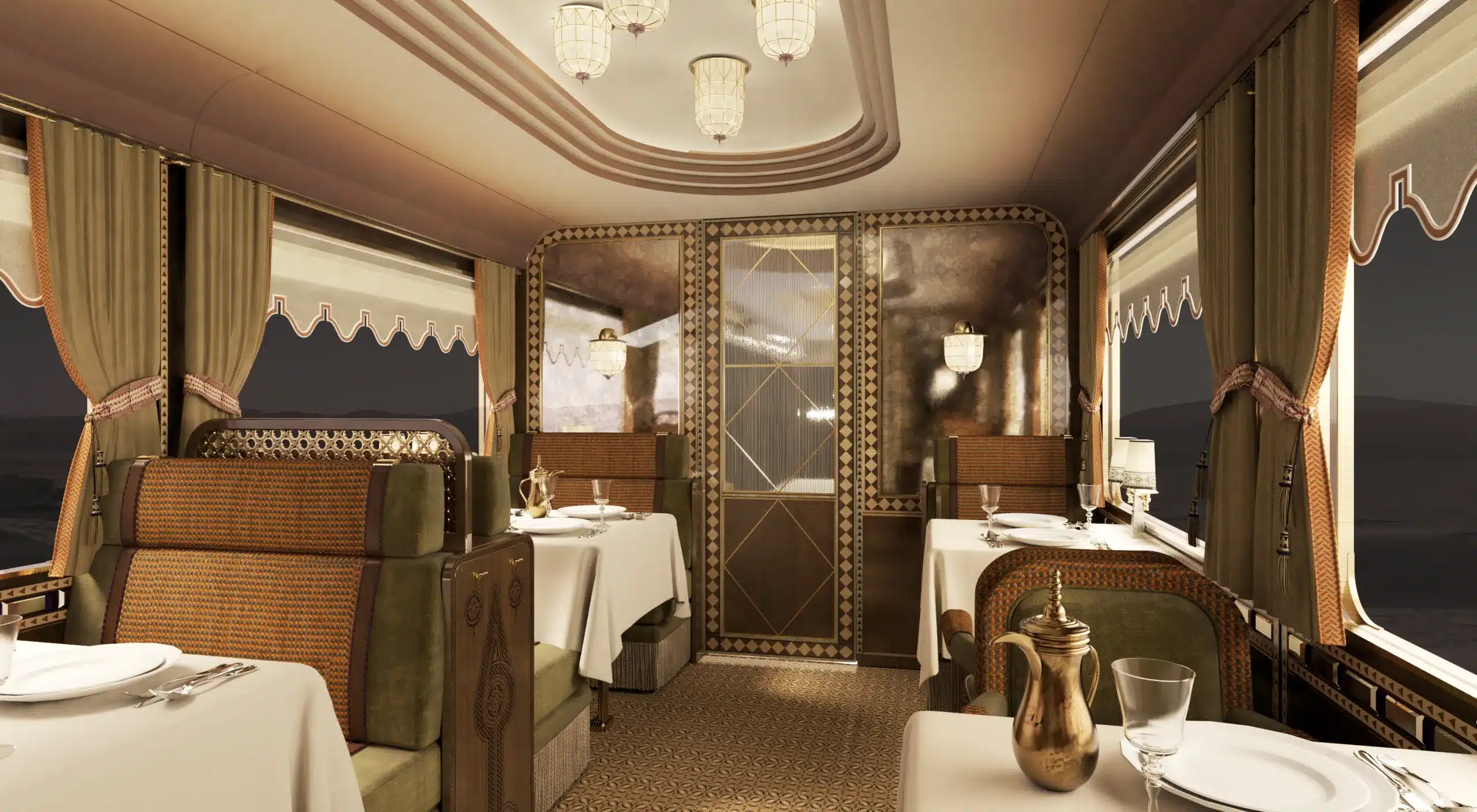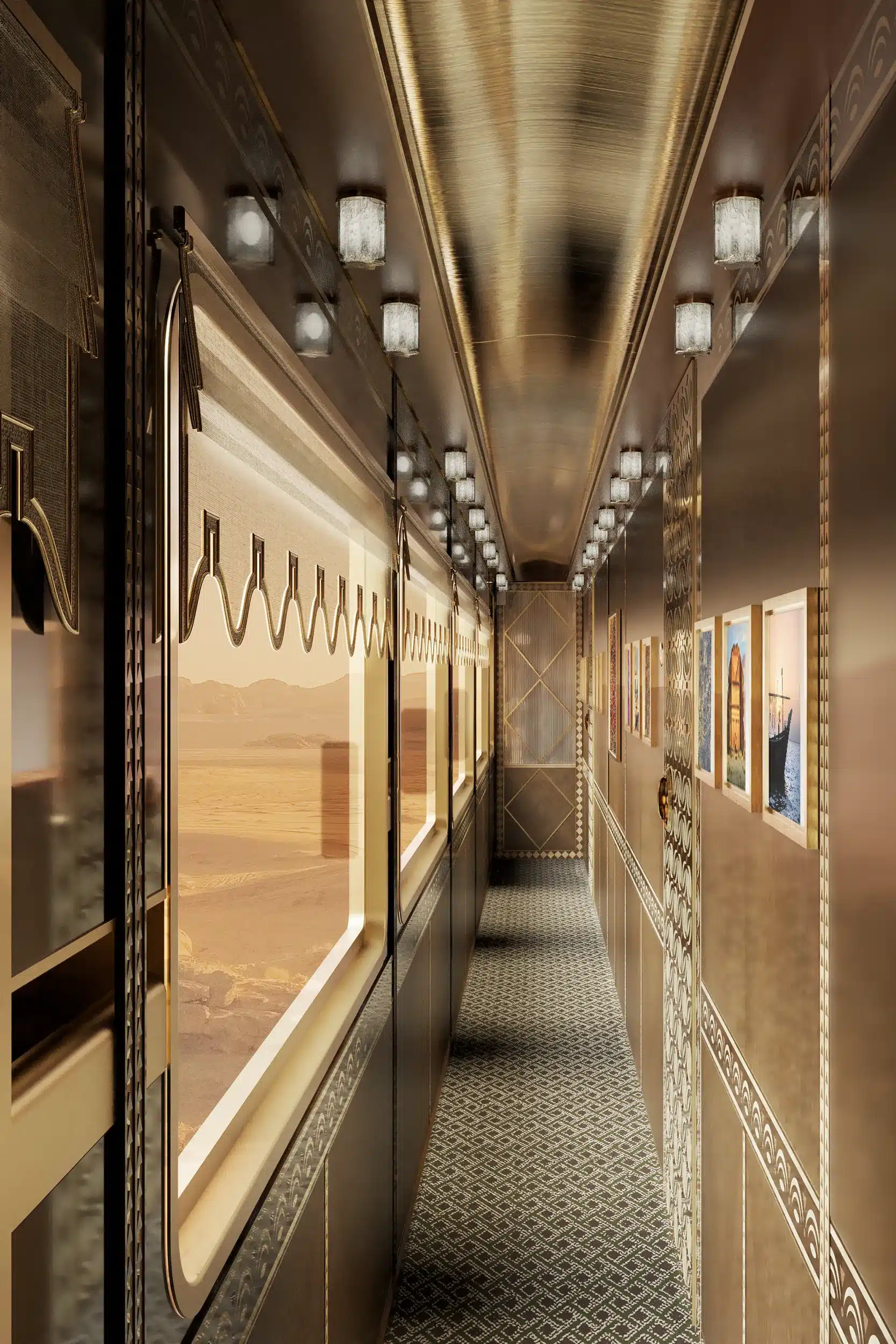 Interiér vlaku vzdává hold všudypřítomné vyprahlé poušti. Paleta písečných, zemitých a jemně zelených barev odkazuje na typickou krajinu Saúdské Arábie. Nenápadně ji rozbíjí lesk tradičního skla z italského Murana a textilie nebo řezby ze dřeva, odkazující na lokální tradiční řemesla. Na 14 vagonů nabídne 33 luxusních soukromých apartmánů a dva prezidentské pokoje, které zvládnou pohostit až na 66 hostů.