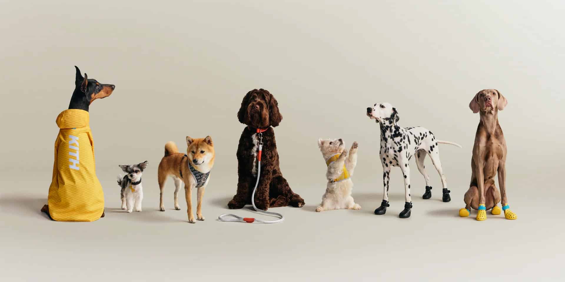 Kolekce zahrnuje oblečení, doplňky na venčení i věci do domácnosti. Objevují se technické bundy do deště, polstrované postroje, vodítka nebo ikonické boty WagWellies v několika barevných variantách. Vedle funkčních prvků přichází i výraznější doplňky, například tašky pro menší plemena nebo designové misky. Launch doprovází i Kith Treats, tedy limitovaná nabídka milkshaků.