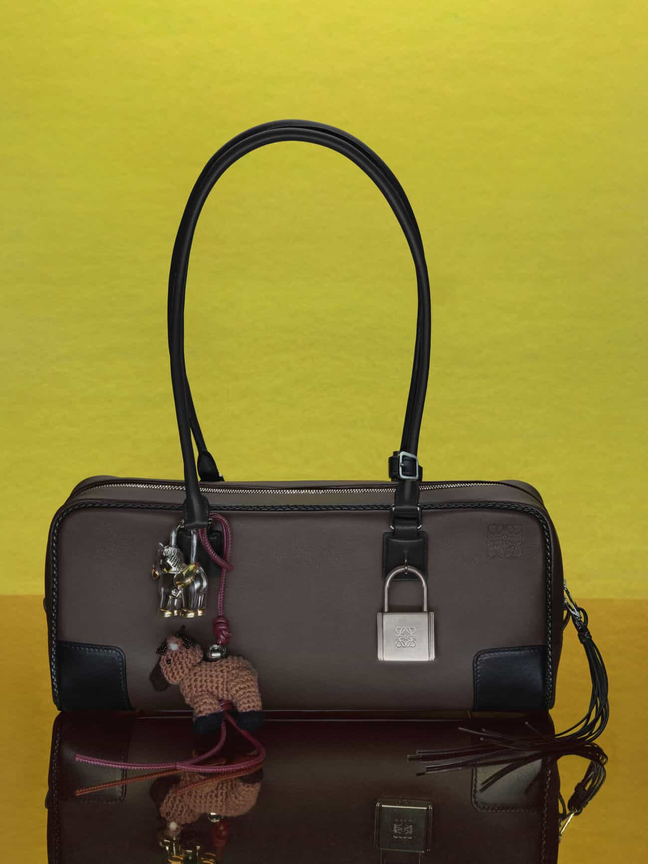 Loewe zvolil všestranný přístup. V nabídce slavné značky najdete jak doslovnou napodobeninu koně v podobě háčkovaného zvířátka, jenž lze snadno připnout na kabelku, tak o něco abstraktnější kousky. Uvedla totiž také tašky s třásněmi, které přímočaře odkazují na jezdeckou a western estetiku. Milovníci drobných detailů pak ocení jemný přívěsek na tkaničky tenisek v podobě nenápadné siluety hřebce.
