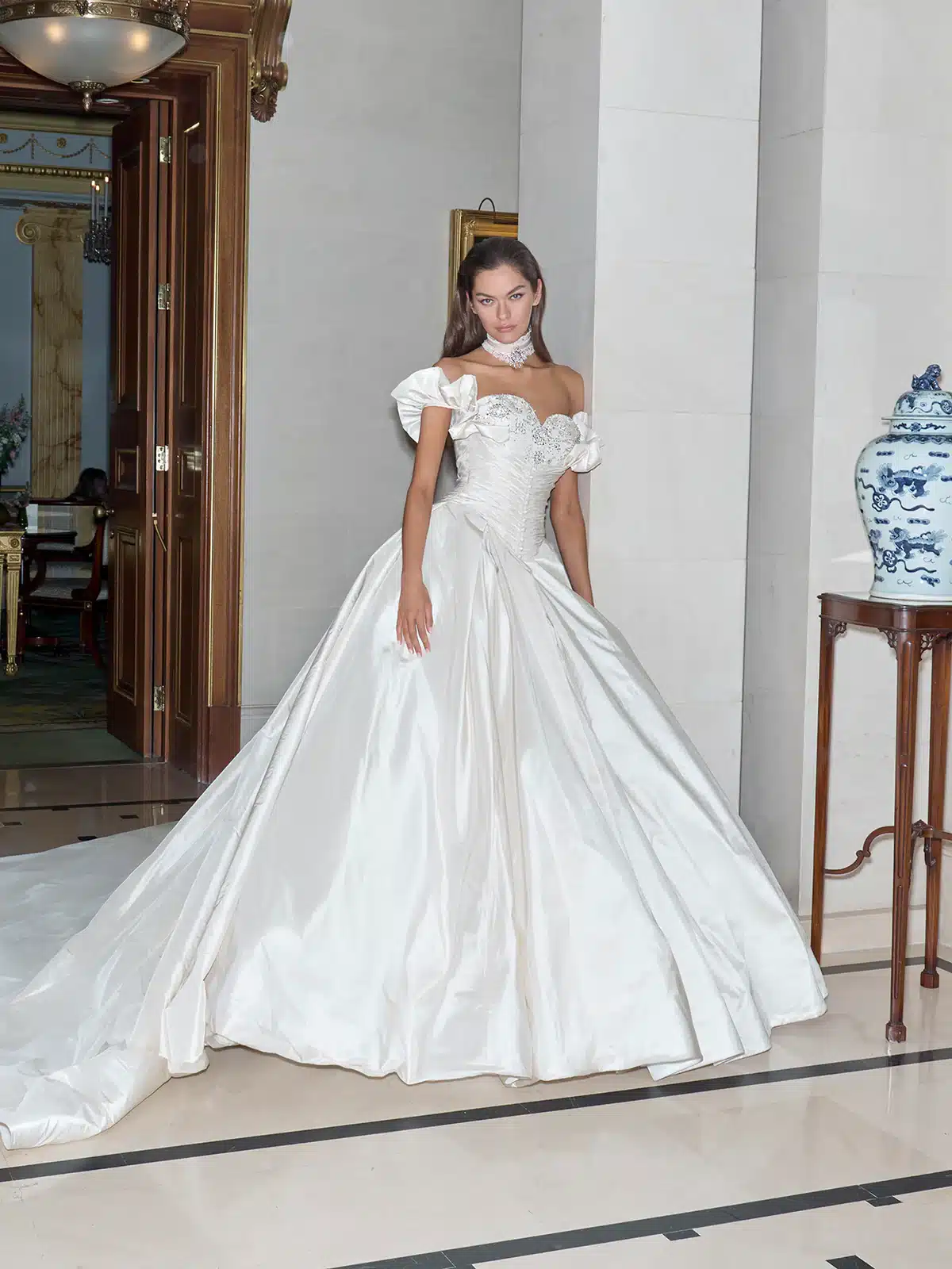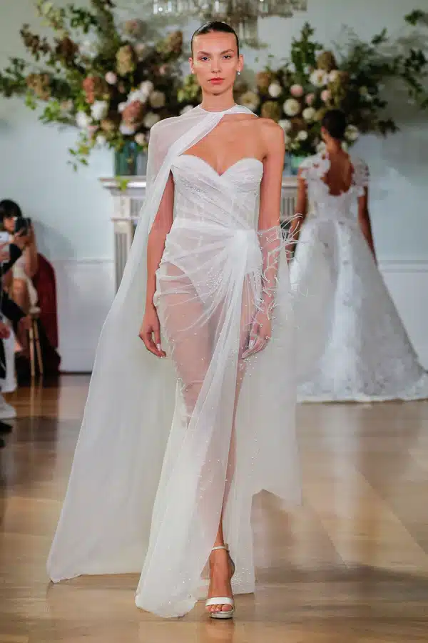 Další ikonou, která svatební kolekce pro podzim 2026 ovlivnila, je Taylor Swift. Své svatební šaty sice světu ještě neodhalila, módní domy mají přesto jasno. Při tvorbě se inspirovaly jejím posledním albem s názvem The Life of a Showgirl. Právě kostýmy tanečnic sloužily jako předloha k o něco extravagantnějším Art Deco róbám. Klasickou bílou střídají odlesky flitrů, záplavy peří nebo odvážný průhledný materiál.