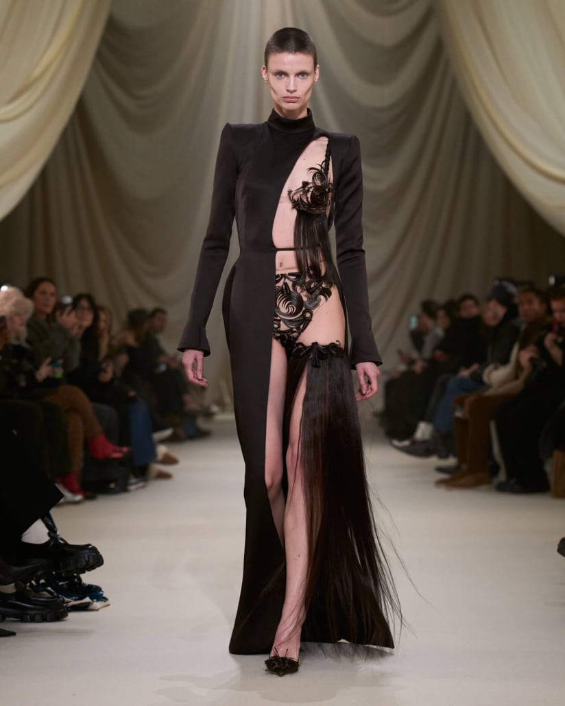Kolekce tak působí jako vytržená z hororu nebo temného vampýrského románu. Klíče, můry a kosterní motivy jsou vetkány do materiálů, zatímco efekt trompe l’œil maže hranici mezi oděvem a iluzí. Satén se vine kolem sochařsky tvarovaných siluet, latex se spojuje s ožehnutými flitry a pálené, záměrně narušené korzety vyprávějí současný příběh o rozkladu a konci, jemuž nikdo neunikne.