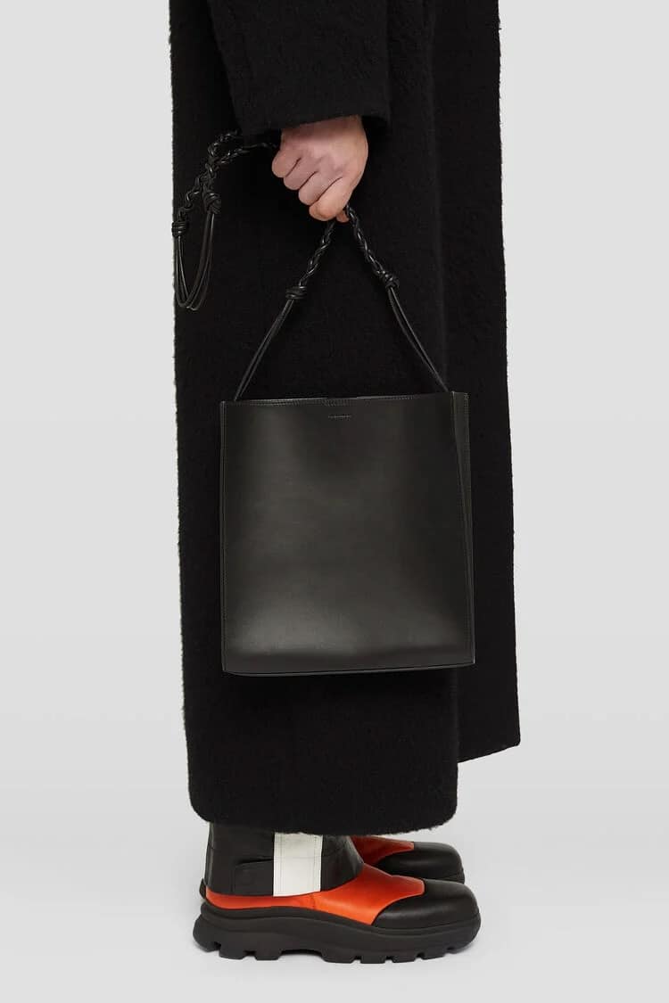 Minimalisté letos najdou ideální kabelku u Jil Sander. Model Tangle Medium patří ke kouskům, které působí až téměř architektonicky. Čistý obdélníkový tvar, hladká černá kůže a pletený popruh vytvářejí tašku, která funguje skoro jako součást samotného outfitu. Výborně sedí k dlouhým černým kabátům, společenským kalhotám, mokasínům i jednoduchým outfitům, postavených jen na kvalitních materiálech. Je to přesně ten typ kabelky, který nepotřebuje logo, aby si ho lidé všimli.