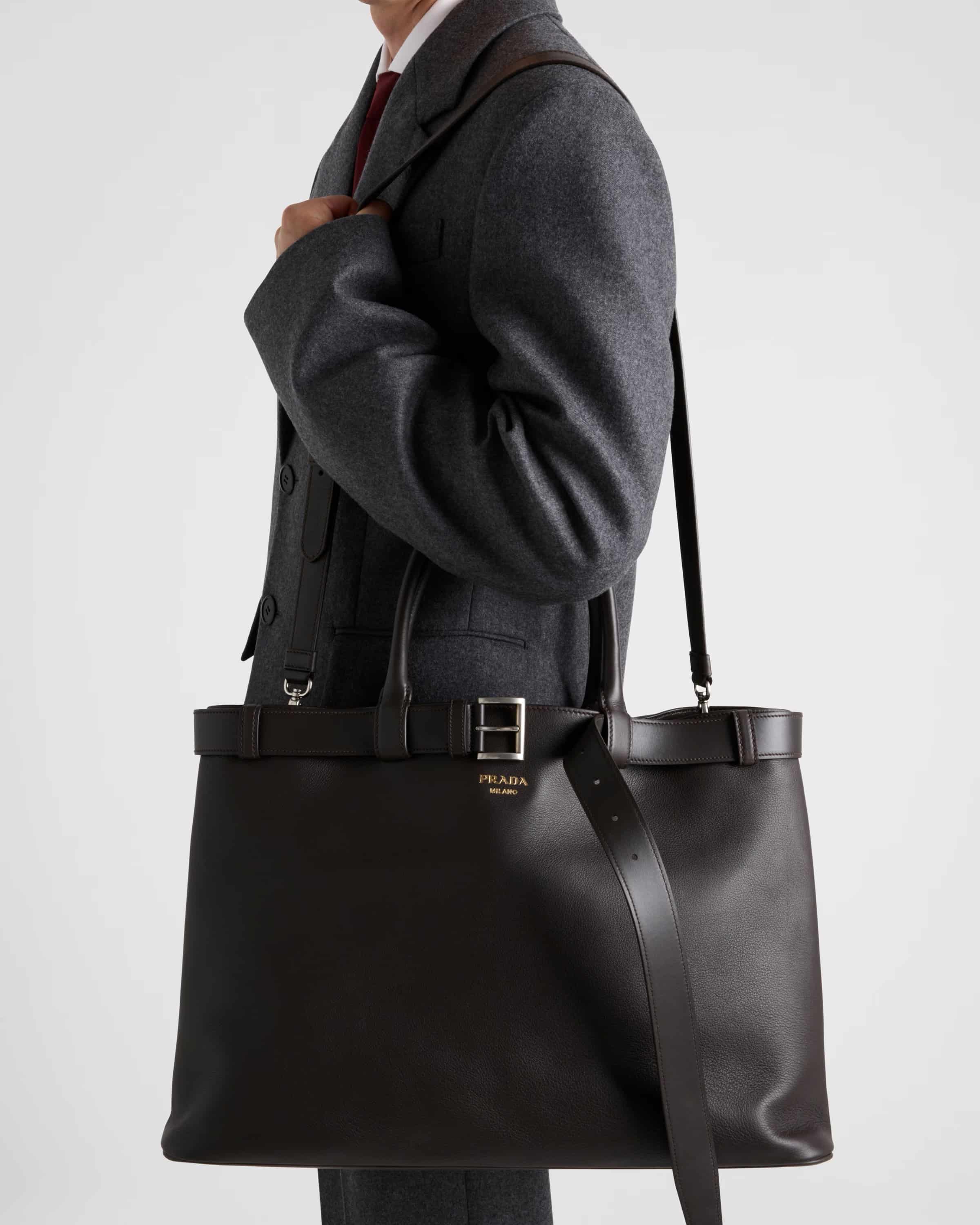 Velkou kapitolou zůstávají tote bags. Například Prada Buckle bag v antiqued leather verzi působí jako moderní interpretace klasické pracovní tašky. Kombinace tmavě hnědé a světle krémové kůže připomíná staré jezdecké vybavení nebo luxusní cestovní kufry. Taška je obrovská, vejde se do ní notebook, dokumenty i věci na víkend, ale stále si zachovává velmi elegantní tvar. Právě to z ní dělá ideální model pro muže, kteří chtějí jednu kvalitní kabelku. Funguje s oblekem, tmavými džínami, trenčkotem i pleteninou.