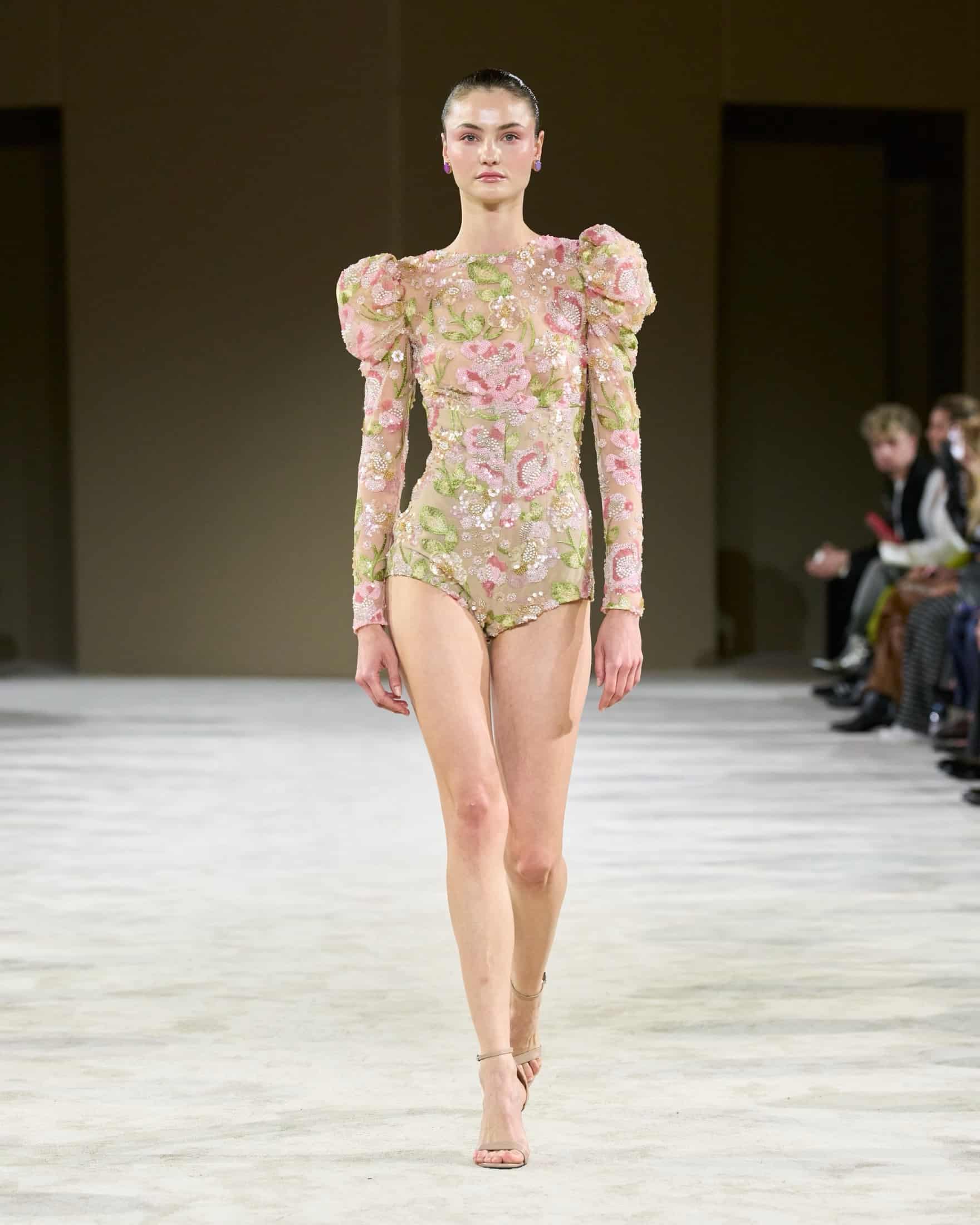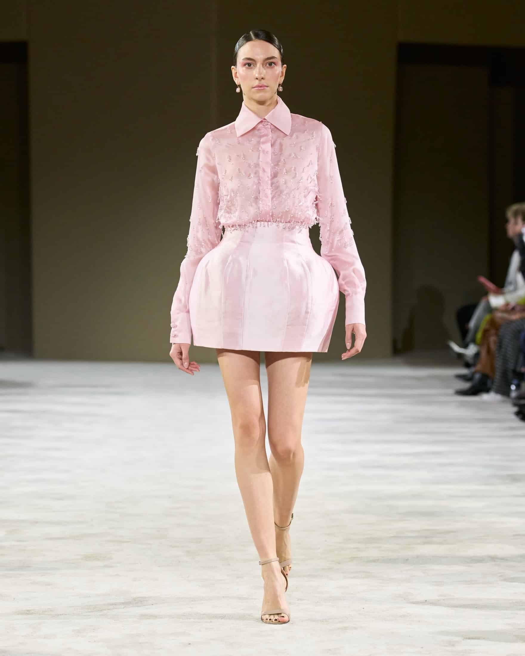 Značka M.Marquisé pak přináší poetcore v preciznější, téměř učebnicové rovině, v níž se romantika propojuje s konstrukcí. Vyšívaný bodysuit s plastickými květinami posouvá klišé motiv florálních aplikací do úplně jiné dimenze, zatímco růžový komplet s objemnou minisukní staví na architektonickém tvaru a čistotě linií. Oblékněte si celý look a máte vystaráno. Stačí nechat siluetu dominovat a doplnit ji střídmými doplňky, ideálně v neutrální paletě. Poetcore tím učí, jak pracovat s proporci, texturou i náladou bez potřeby složitých kombinací.