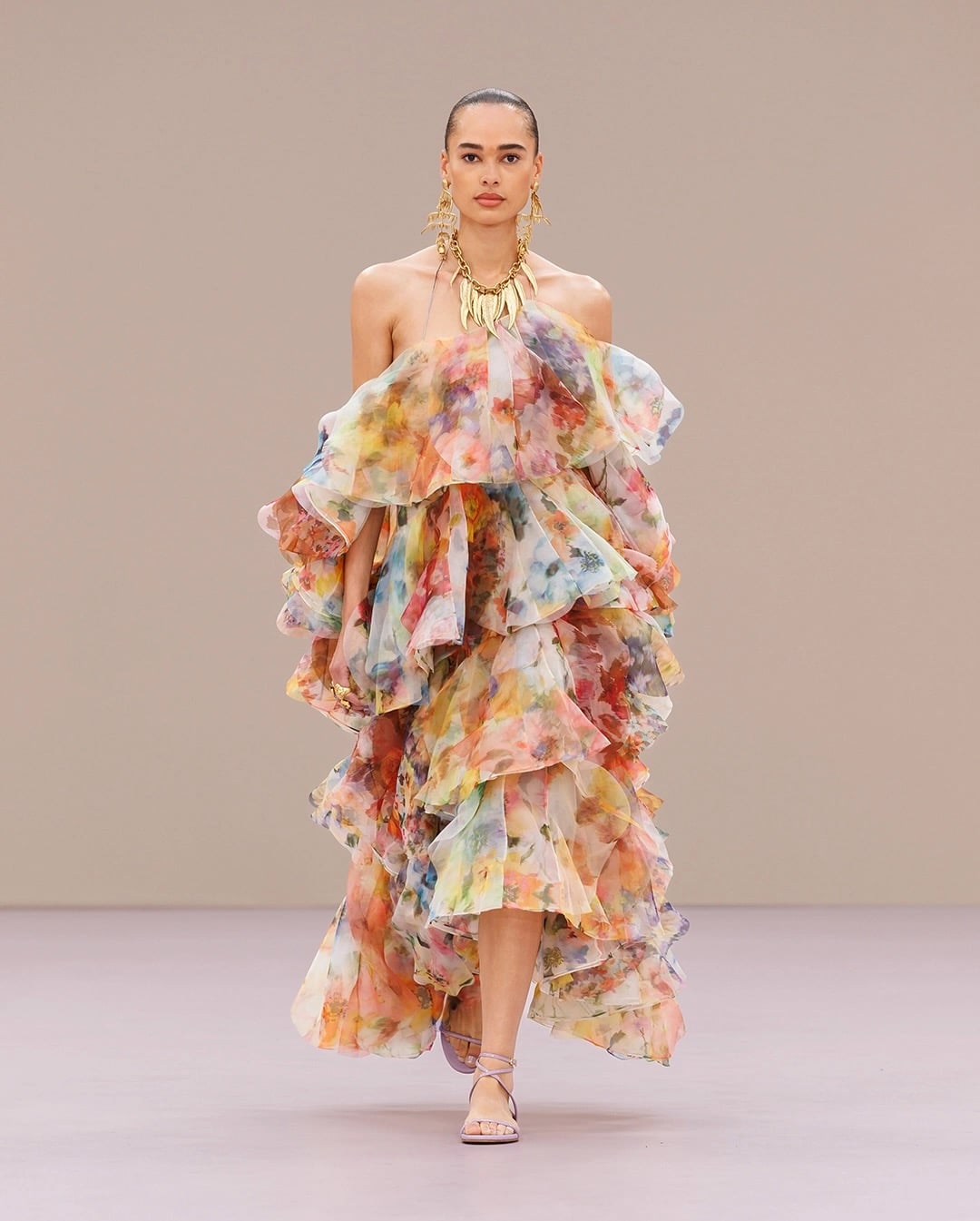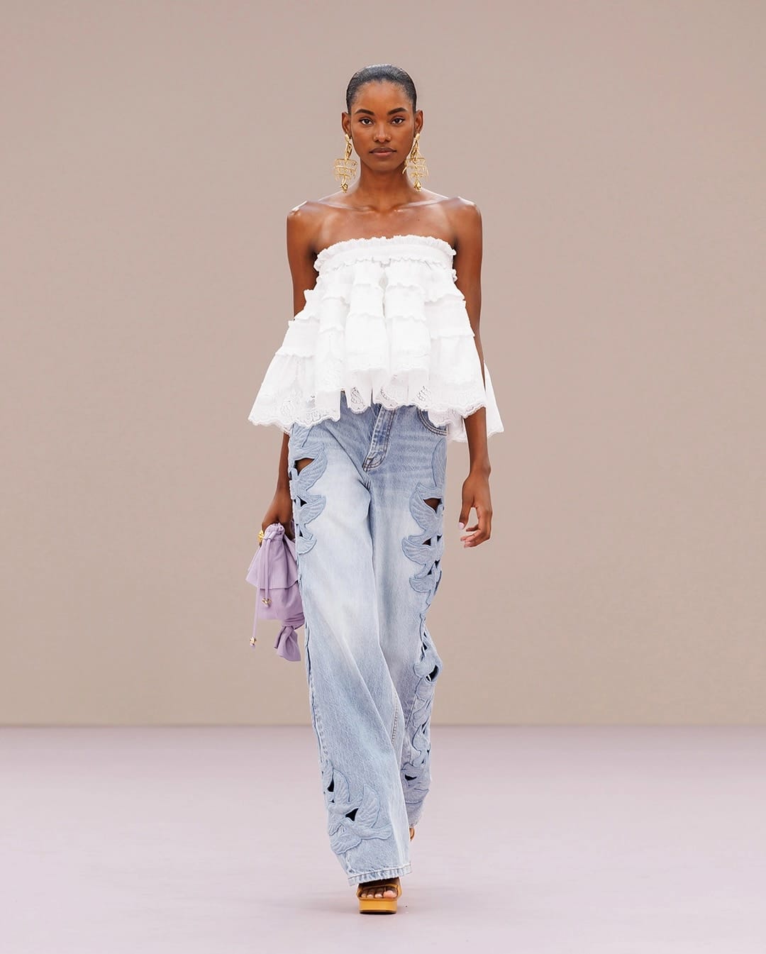 Kde to vše sehnat? Například běžně dostupná značka Zimmermann rozvíjí poetcore do podoby, která působí lehce, vrstveně a zároveň jednoduše. Vrstvené šaty s akvarelovými květy se pohybují s tělem a vytváří dojem neustálé proměny, zatímco volánkové struktury pracují s objemem tak, že silueta zůstává vzdušná. Objevují se také krajkové topy s jemným řasením, kombinované s denimem a výraznými šperky. Styling stojí na vyvážení. Výrazný kus doplní minimalistická obuv, jemné sandály či džíny, díky čemuž celek drží linii a nepůsobí přeplněně.