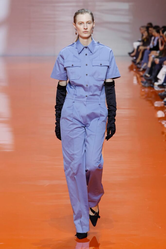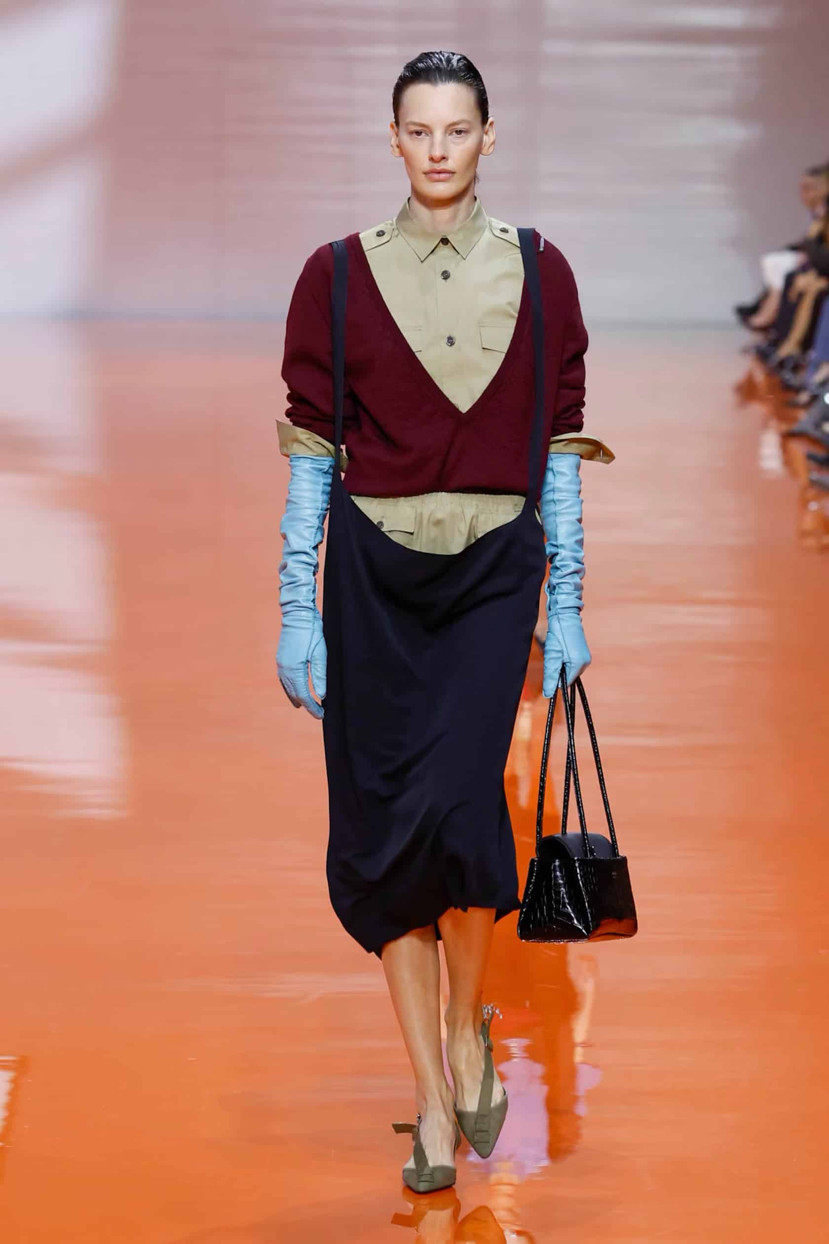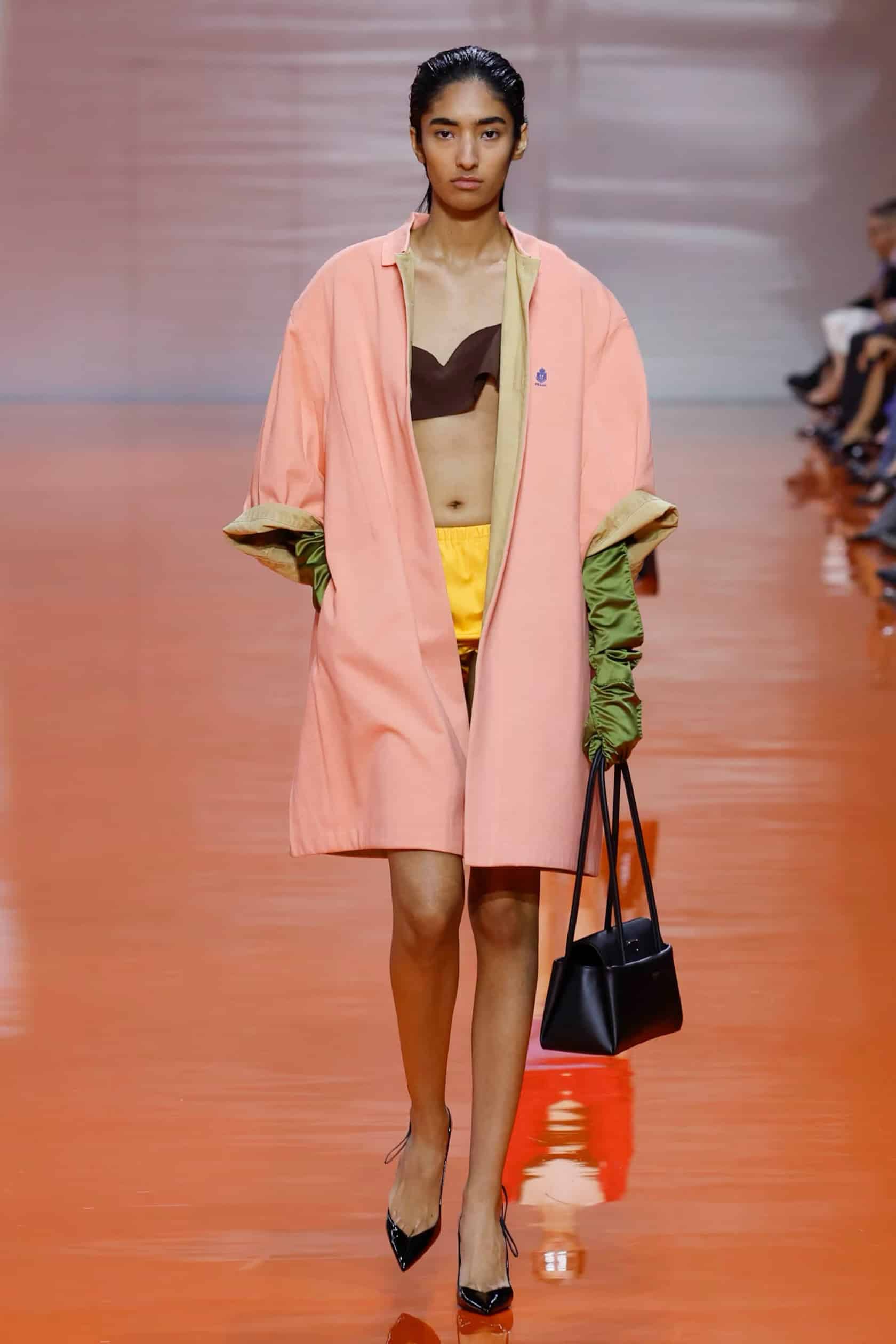 Barevná paleta stála mezi indigem, zelení a citronovou žlutí, přičemž jednotlivé tóny se střetávaly v dynamických kontrastech. Saténové rukavice v blankytných a olivových odstínech stoupaly po pažích a vytvářely dojem pokračování. Drobné erby zdobily hrudě a miniaturní braletky vyvažovaly bezforemné trenčkoty. Návrhy fungovaly jako výrok o pohybu a adaptabilitě, čímž Prada podtrhla myšlenku, že oblečení může žít vlastním životem bez nutnosti pevného zařazení.