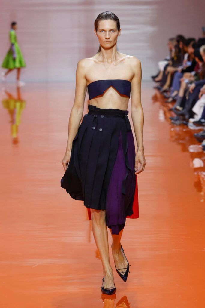První pohled patřil prostoru, jehož podlaha zářila sytým oranžovým lakem a odrážela světlo do všech stran. Balonky v barvách mandarinky a krémové vymezily cestu k sáu, kde hosté jako Emma Chamberlain, Sadie Sink či členové skupiny Enhypen sledovali módní remix, který překračoval zvyklosti. Návrhy pluly po ploše, která evokovala digitální laboratoř, a oděvy připomínaly, že krása může vznikat z chybného výpočtu stejně přesvědčivě jako z pečlivého plánu.