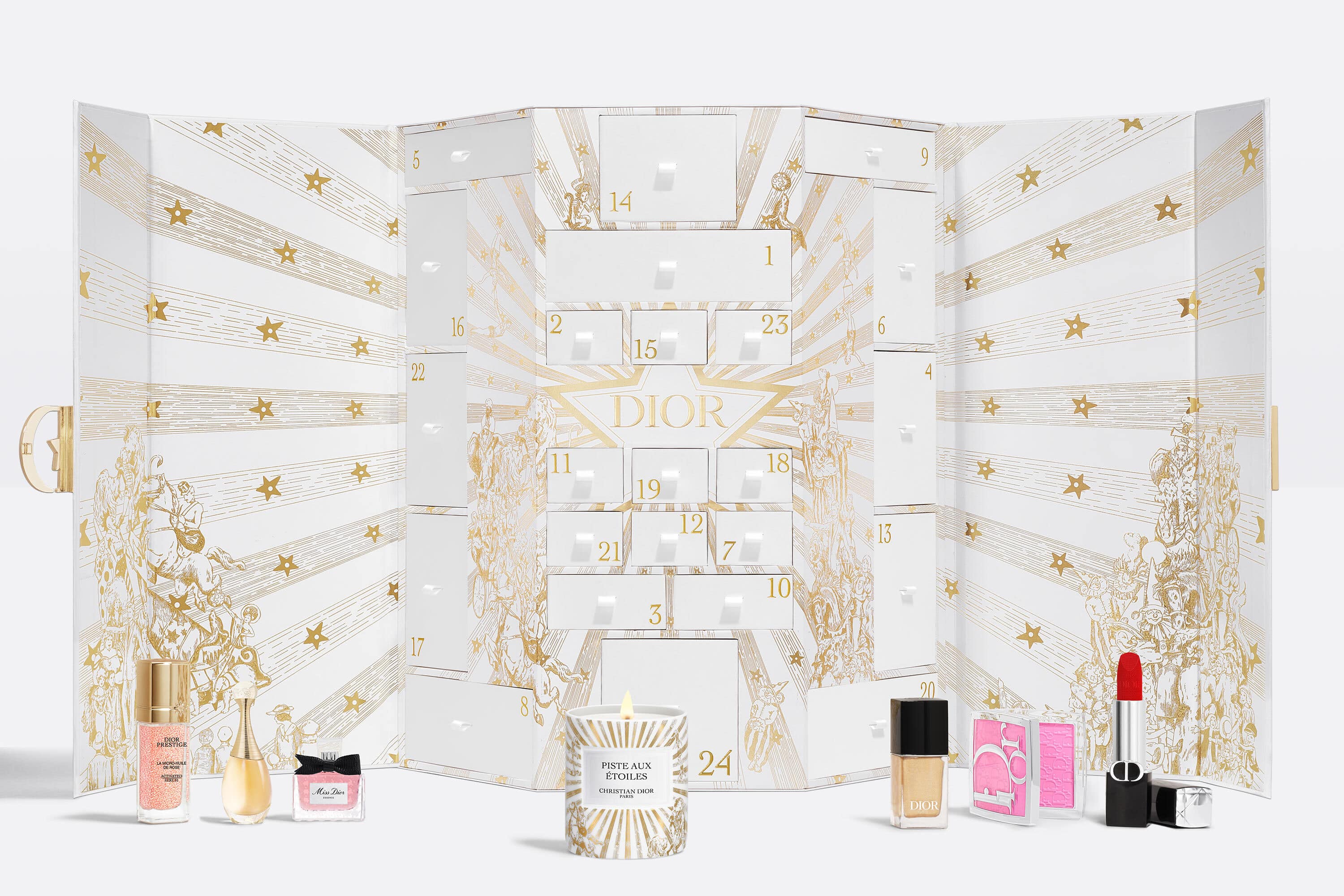 Jak by řekla Mariah Carey, „It’s Time!“. Svět beauty oficiálně odstartoval vánoční sezónu a Dior není pozadu. Letos si pro sváteční sezónu připravil adventní kalendář, který svými proporcemi vyobrazuje dechberoucí historický butik na adrese 30 Avenue Montaigne. Fasádu tohoto domu zdobí zlaté ornamenty vypracované umělcem Pietrem Ruffo a po otevření na vás dýchne atmosféra Circus of Dreams, kterou Christian Dior tolik miloval. Box pak nabízí výběr z vytříbených parfémů přes sofistikovaný make-up a produkty péče o pleť až po vonnou svíčku.