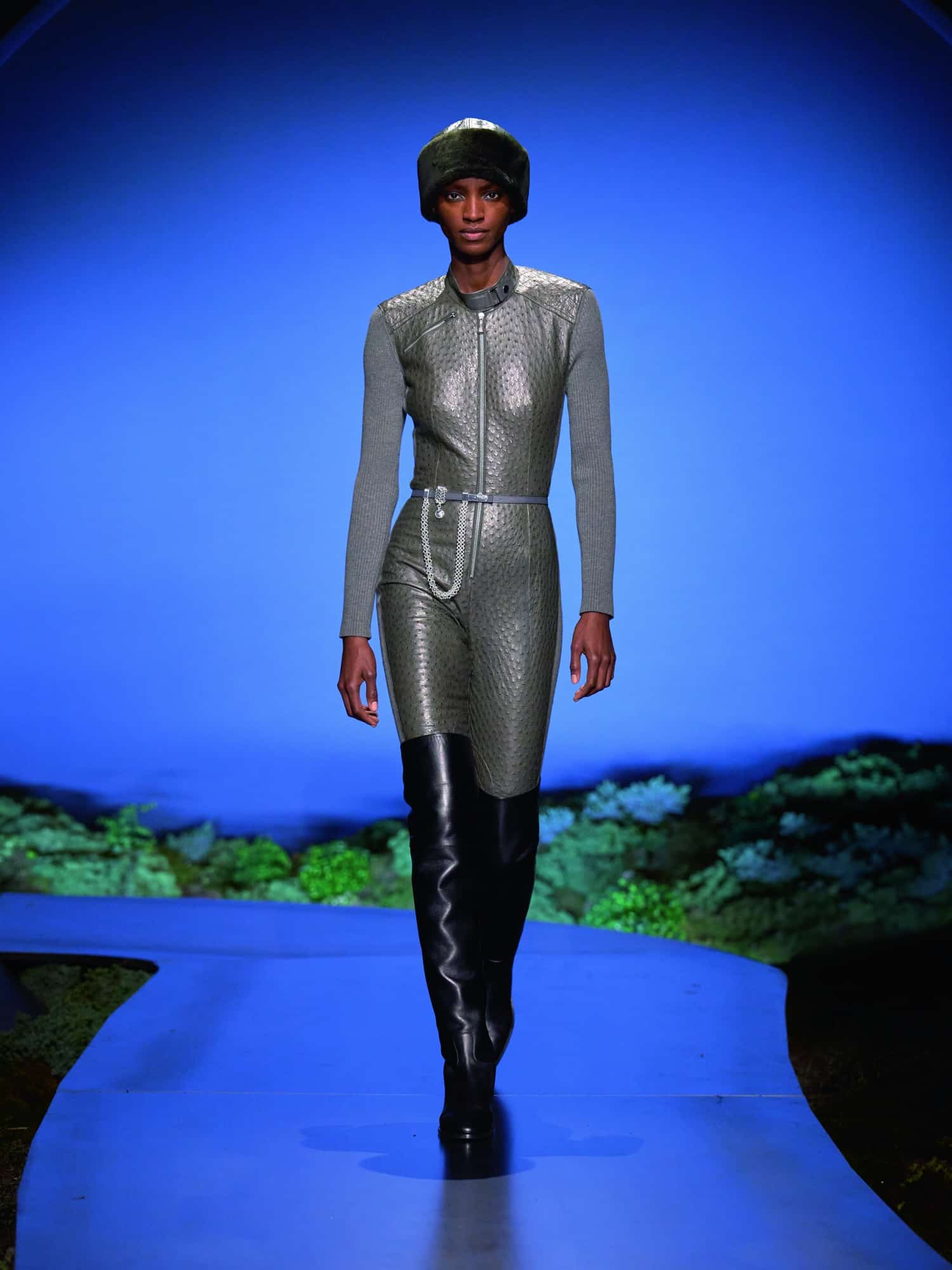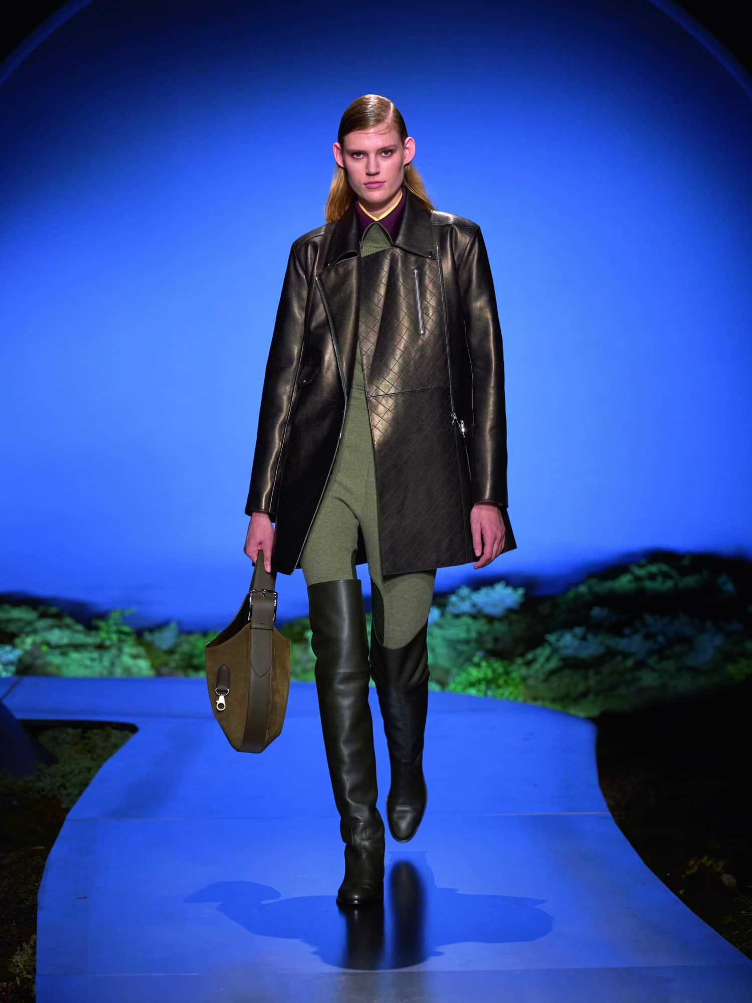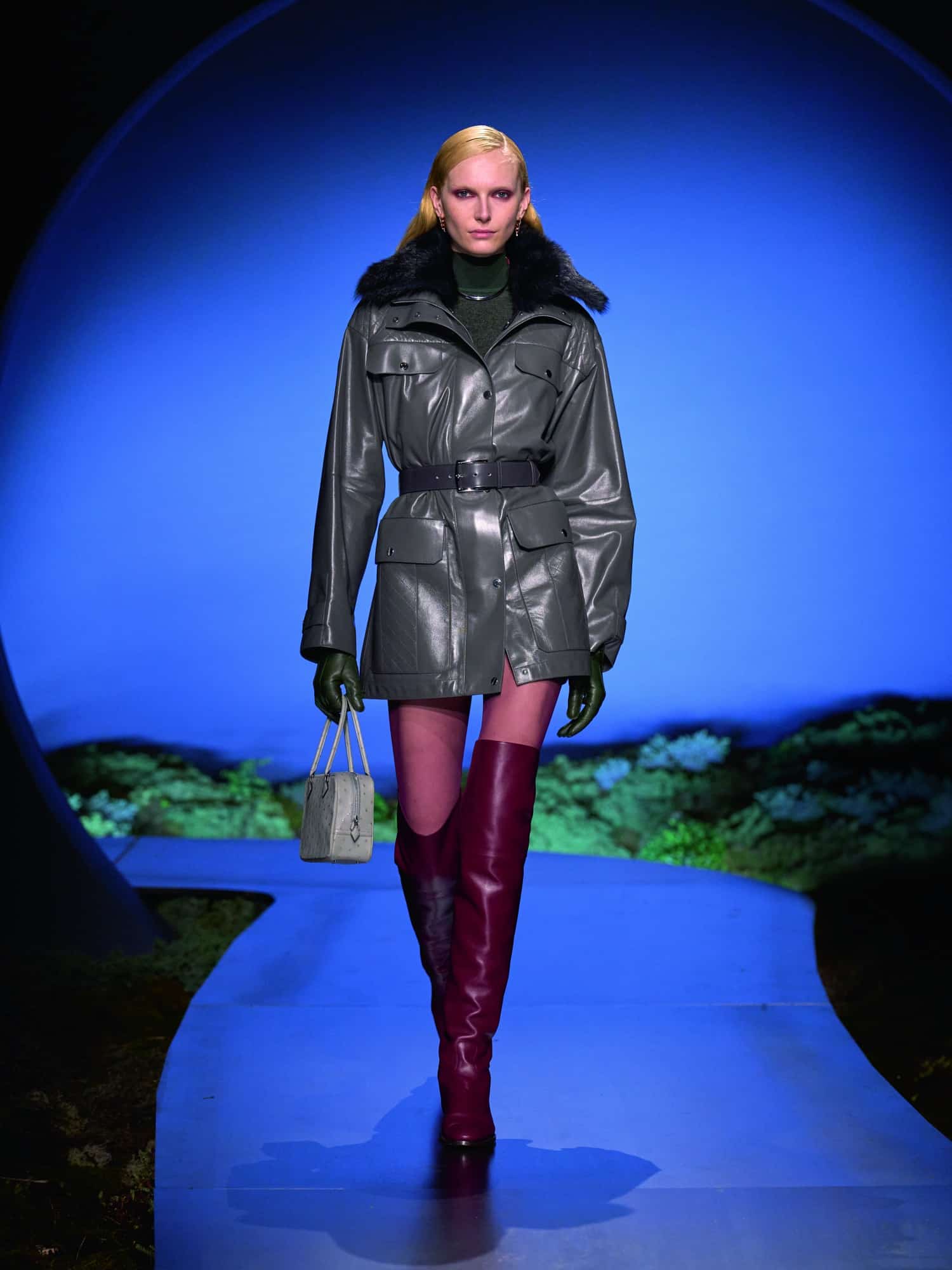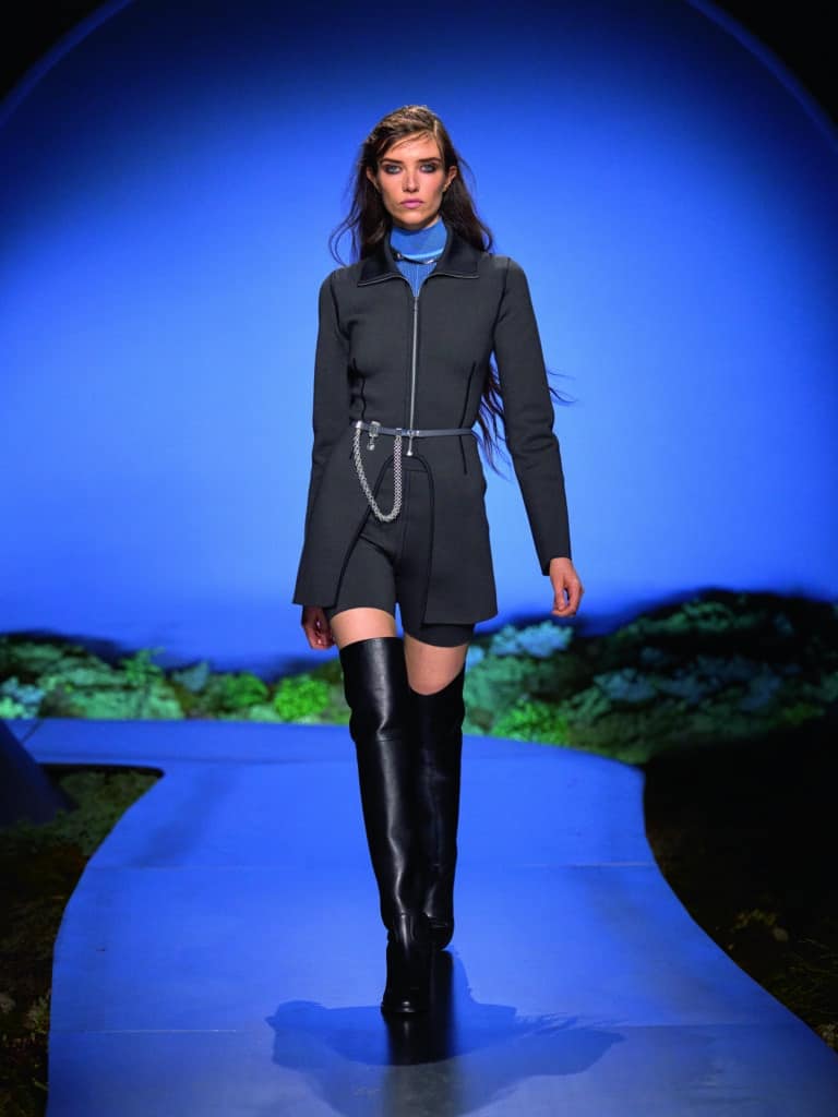 Ty odkazují na motorkářský styl, ale také jezdectví, které se tradičně propisuje do kovových detailů, pas definujících kabátků i nad stehna sahající kozačky, po kterých opakovaně toužebně pokukujeme. Drsnost tmavnoucího světa vyvažuje nostalgický nádech 60. let diktující mini sukně, do A střižené šaty se zipem i roláky. Jeho eleganci cítíme ve chvíli, kdy kolem nás v návrzích projdou modelky, pomalu, ale s cílem.