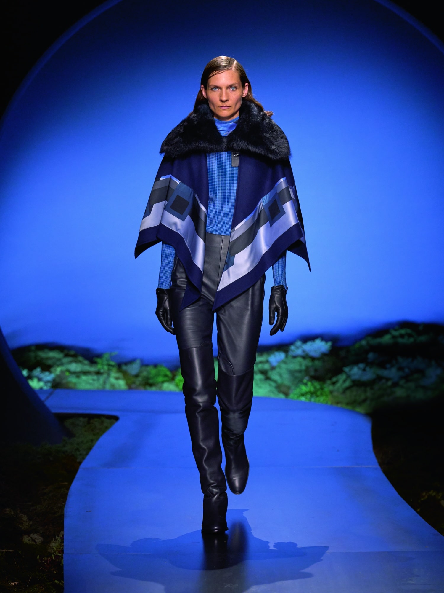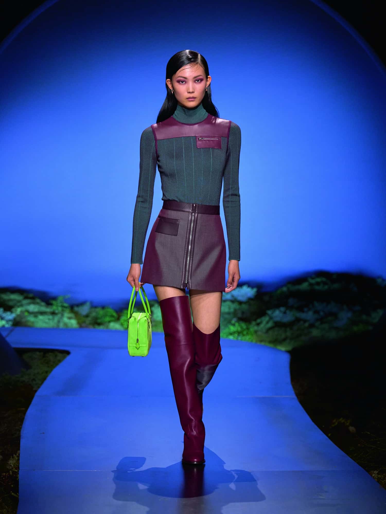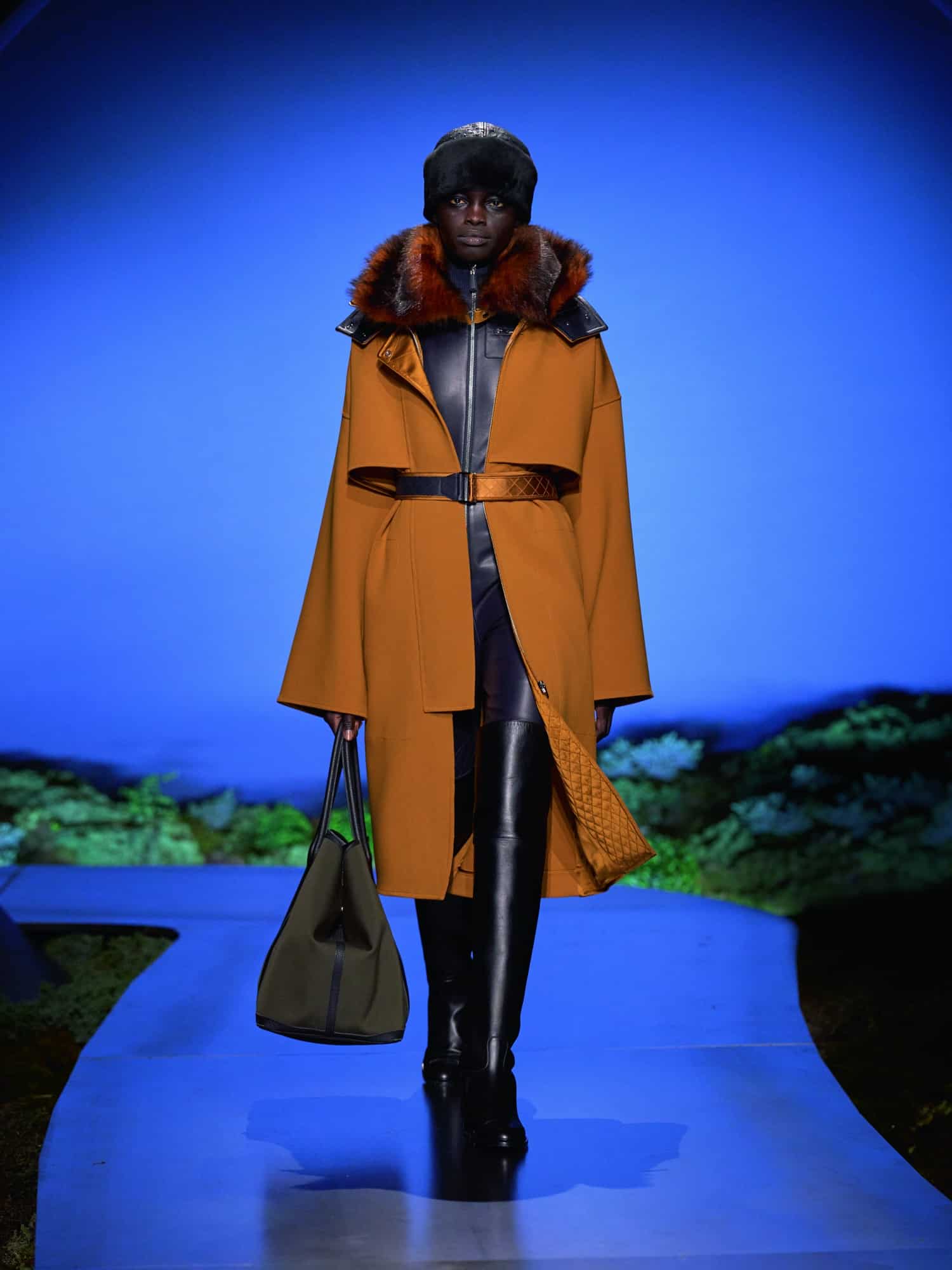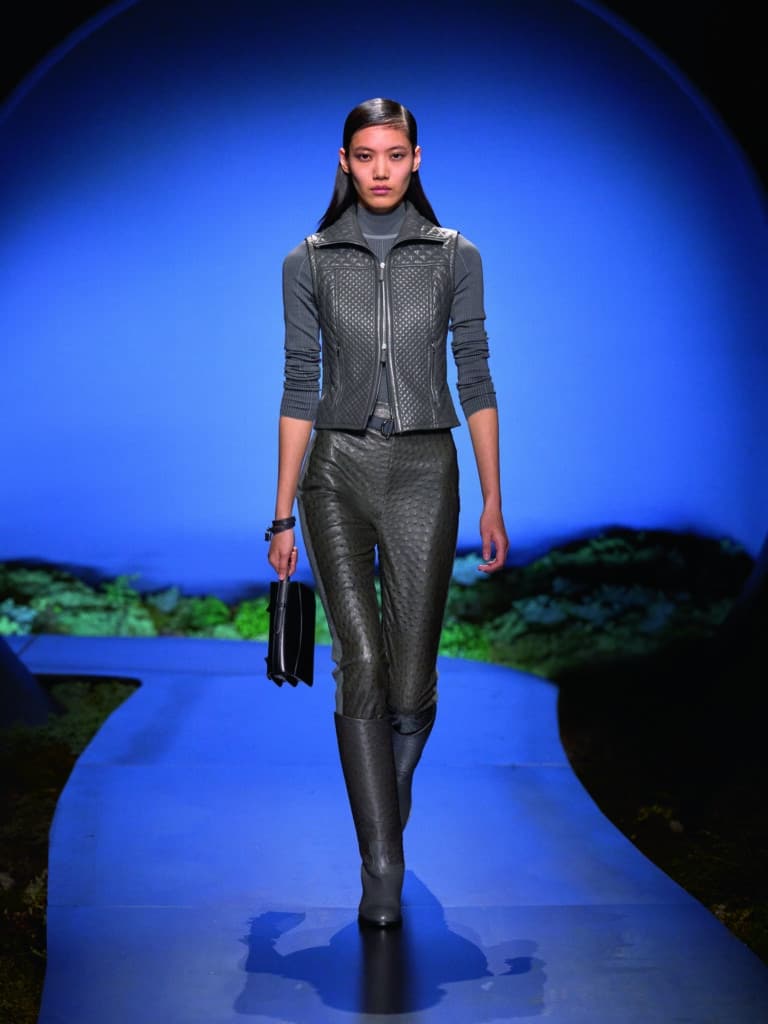 Ty odkazují na motorkářský styl, ale také jezdectví, které se tradičně propisuje do kovových detailů, pas definujících kabátků i nad stehna sahající kozačky, po kterých opakovaně toužebně pokukujeme. Drsnost tmavnoucího světa vyvažuje nostalgický nádech 60. let diktující mini sukně, do A střižené šaty se zipem i roláky. Jeho eleganci cítíme ve chvíli, kdy kolem nás v návrzích projdou modelky, pomalu, ale s cílem.
