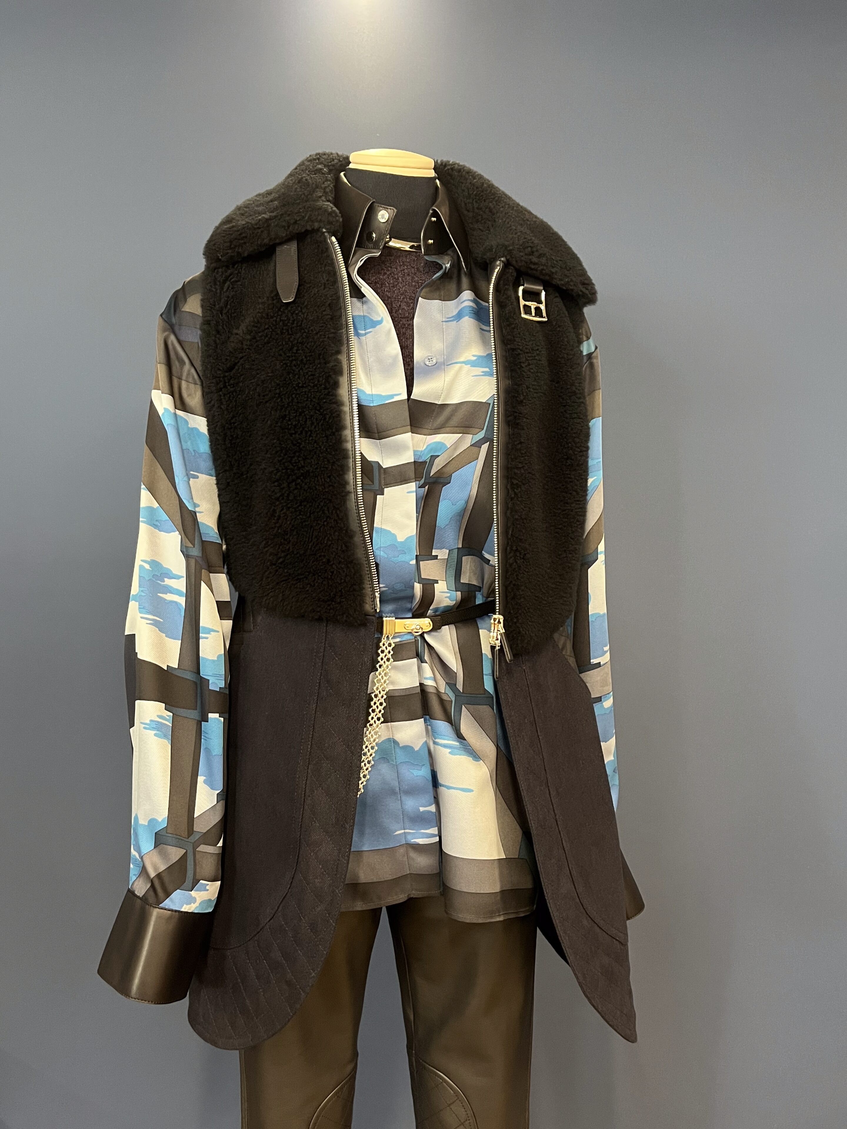Pocit iluze či nikdy nekončící nejistoty utváří rovněž motiv z dílny umělce A. M. Cassandre, který vytvořil již v roce 1951. Motiv šátku s názvem Perspective v nejnovější kolekci nabývá podobu grafického potisku několika looků. Jak procházíme po dřevěných parketách přemalovaných na černo, objevujeme ho v podobě hedvábné košile či vzdušné kápě. Perfektně doplňuje asymetrické střihy kolekce.