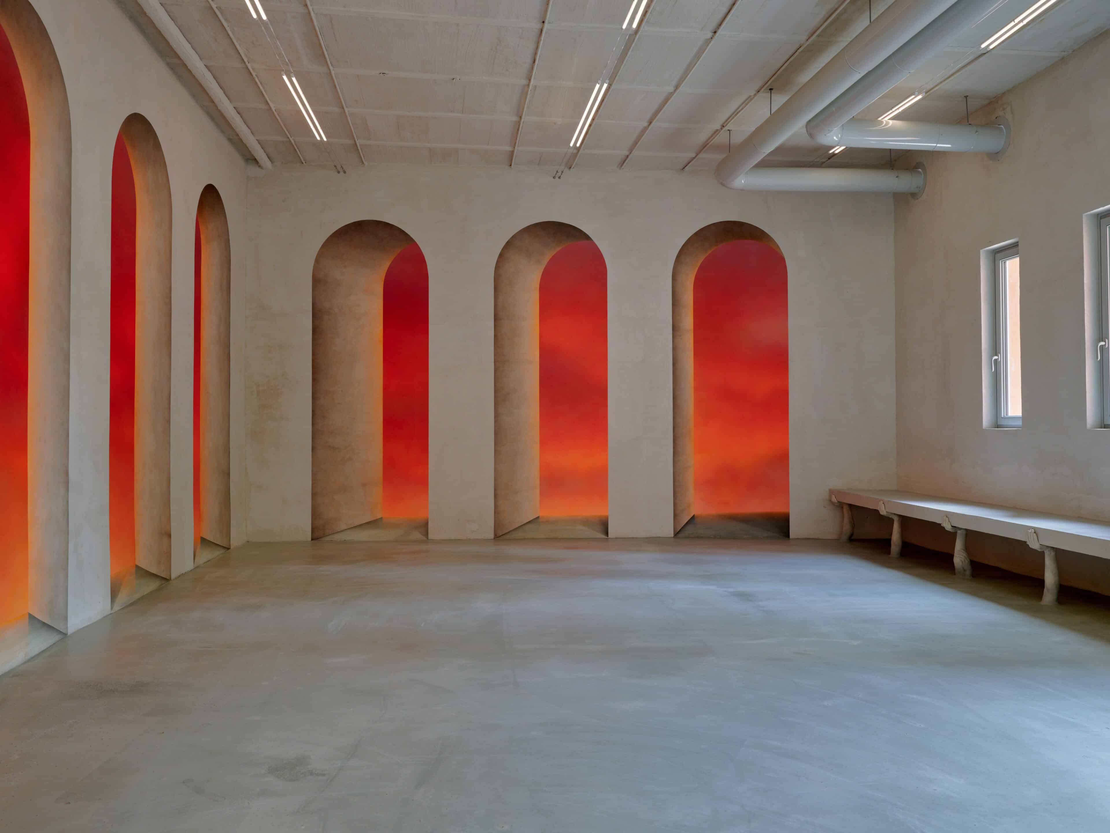 Prostor pak doplňují malby Christophera Page. Na stěnách se objevují oblouky a arkády, které se opticky otevírají do dalších místností. Barvy přecházejí od okrové přes rezavou až po sytě červenou, připomínající rozžhavené jádro země. Odkaz na metafyzickou tvorbu Giorgia de Chirico je patrný v prázdných architekturách a zvláštní perspektivě. Pro nezasvěcené, de Chirico byl italský malíř počátku 20. století, známý především obrazy tichých náměstí a podivně prázdných měst, která působí spíš jako sen než skutečné místo.