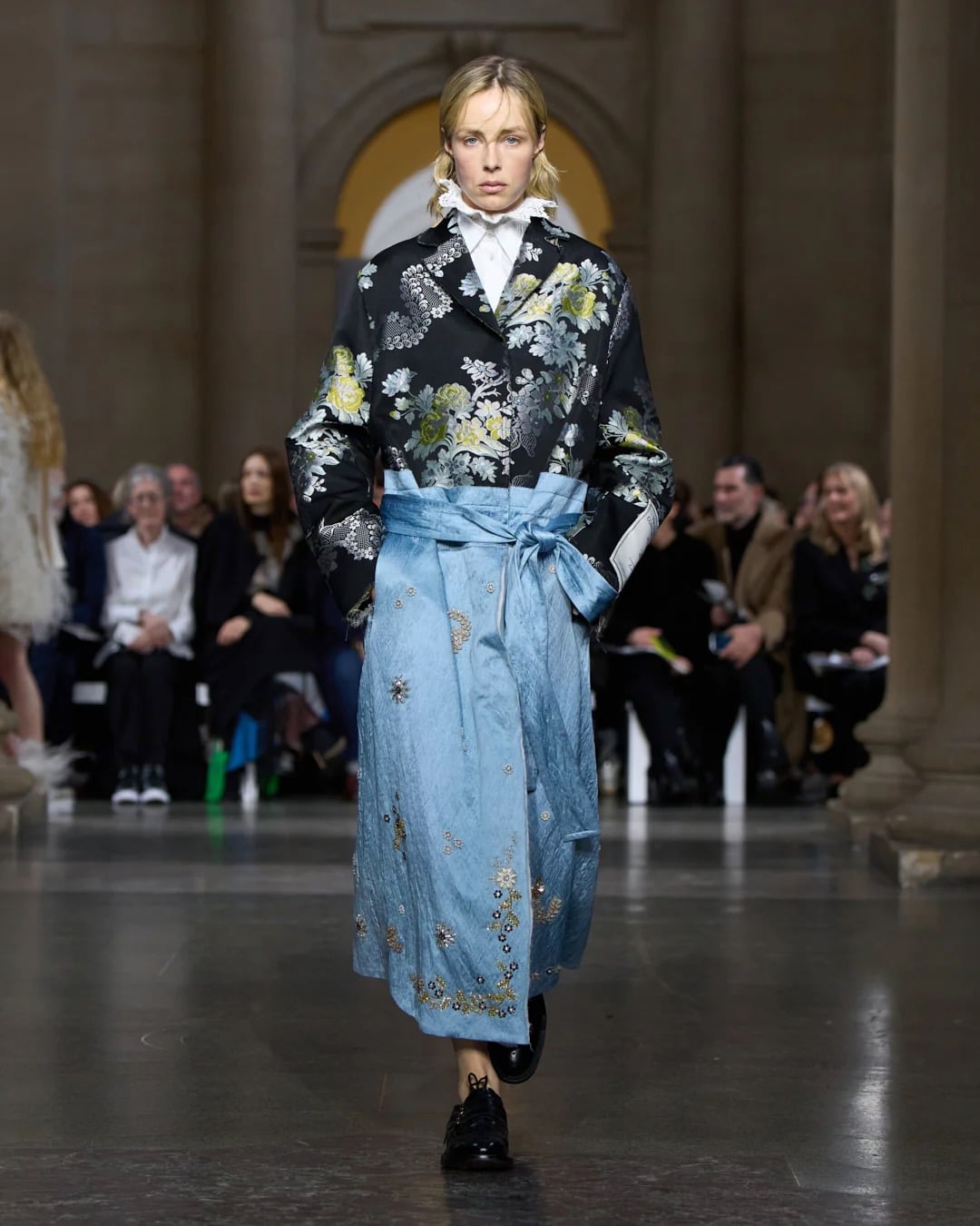 Zároveň je pozoruhodné sledovat, jak se význam florálních vzorů v rámci let mění. Dlouhá léta symbolizovaly bezpečnou eleganci nebo sezónní romantiku, jež z mol skákaly rovnou do běžných obchodních řetězců. V nových kolekcích se z nich ale stává úplně jiný symbol. U Erdem připomínají paměť, u Simone Rocha emoce a dospívání. Oba módní domy pracují s podobným principem. Právě proto působí přehlídky tak osvěžujícím dojmem. Květiny se nevracejí jako každoroční trend, ale jako způsob uvažování o zimním šatníku.